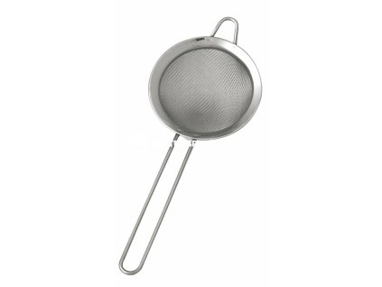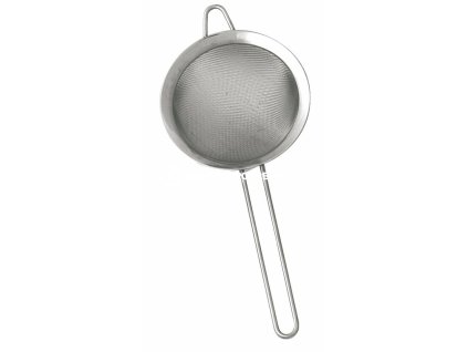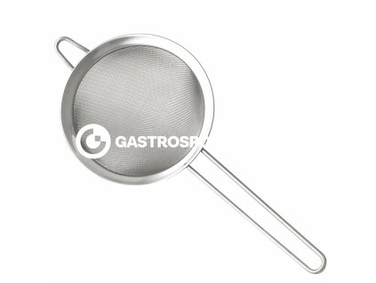 Profesionalní celonerezový cedník s jemným sítem a plastovou rukojetí pro snadnou manipulaci při práci.