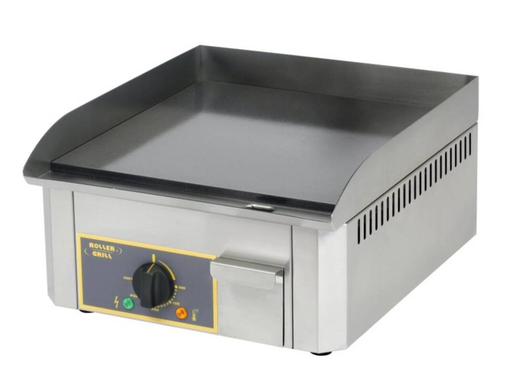 Elektrická grilovací deska PSR 400 EE od francouzského výrobce ROLLER GRILL. hladká pracovní grilovací plocha z černého emailu síla grilovací desky 10 mm vyjímatelná zásuvka na nečistoty na přední straně žlábek pro zachytávání mastnoty rovnoměrné rozložení tepla po celé ploše desky – 1 nezávisle ovládané topné těleso termostat s regulovatelným nastavením teploty 0 – 300 °C kontrolka zapnutí grilovací desky nerezová konstrukce a zesílená izolaceDoplňkové parametry