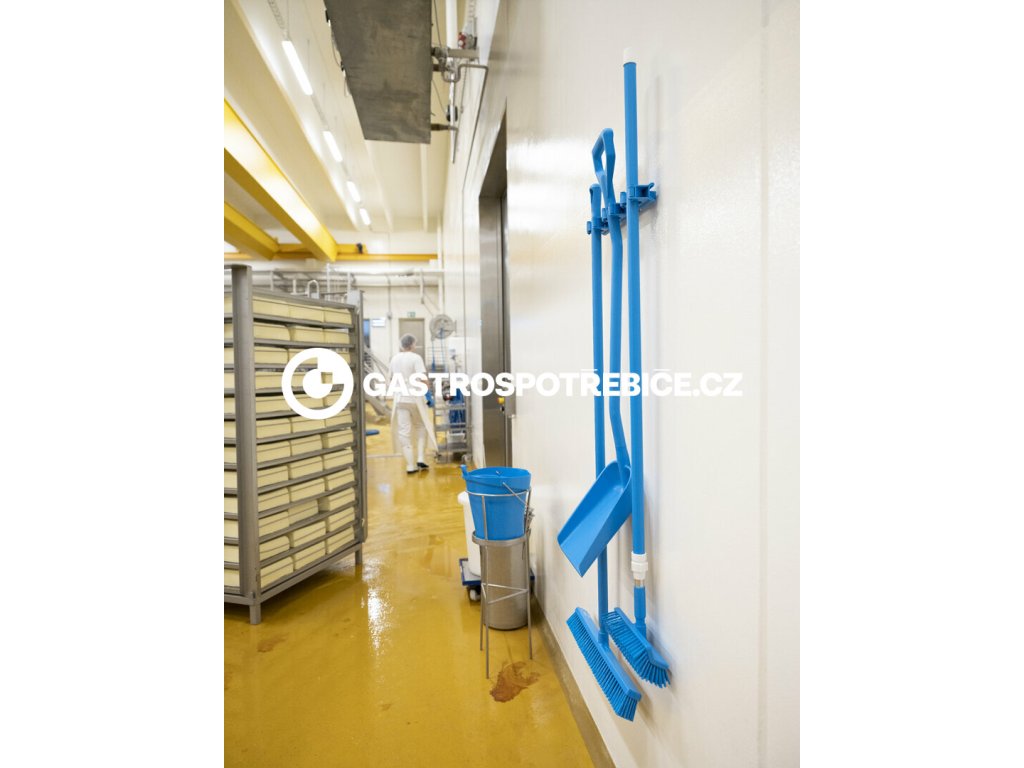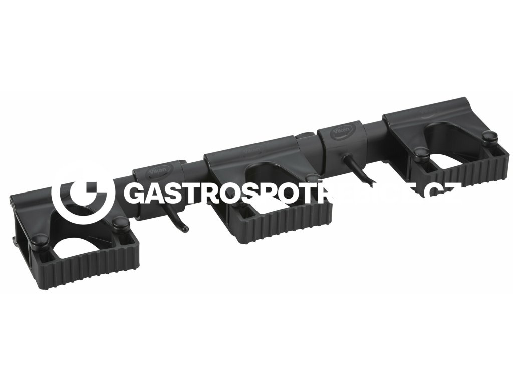 Černá varianta modulárního nástěnného držáku pro uložení hygienického nářadí a pomůcek na pracovišti. Barevné varianty jsou určeny k použití v rámci barevného kódování. Lištu lze snadno připevnit na 4 nástěnné držáky nasunutím z pravé nebo levé strany. K dispozici jsou dva druhy úchytů – jeden pro zavěšení (háček) a jeden pro pevné uchycení. Na lištu lze umístit 1-10 úchytů (Max. 10 háčků na zavěšení nebo max. 5 na pevné uchycení). Úchyt pro pevné uchycení pojme produkty o průměru 28–33 mm. Háček udrží produkty o hmotnosti až 3 kg. Systém se dodává se 3 úchyty pro pevné uchycení a 2 háčky. Produkt lze snadno rozebrat za účelem čištění nebo výměny. Vikan je přední světový výrobce čisticího nářadí. Výrobky dánské společnosti usnadňují úklid zákazníkům od Spojených států až po Čínu. Firma dodává smetáky, kartáče, vědra a další produkty.Doplňkové parametry