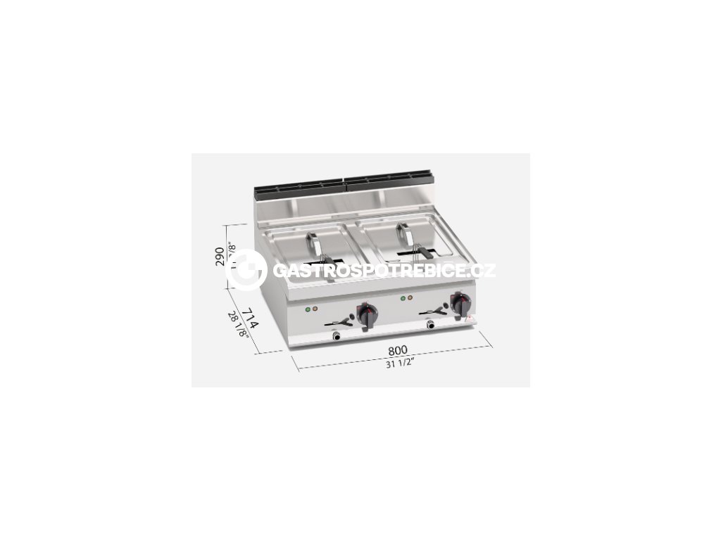 Topné těleso umístěné přímo ve vaně. Snažší čištění umožňuje odklopení topného tělesa směrem nahoru. Bezpečnostní zařízení pro přerušení napájení při odklopení spirály nahoru. Kontrola teploty termostatem od 80 °C až 190 °C s přesnějším zjišťování teploty díky senzorům umístěným ve vaně. Světelná signalizace ovládání s indikátorem teploty. Elektrické a plynové fritézy jsou vybaveny mechanickým ovládáním s přesným řízením teploty. Technologie přímého ohřevu s vysokou účinností hořáků a topných spirál zaručuje velmi rychlé nahřátí a rozvod tepla velkým povrchem zabraňujícím přepalování oleje. Nádrž se zaoblenými hranami a úchytem pro zavěšení koše poskytuje provozovateli maximum hygieny a pohodlí spojeného s bezpečím při práci. Výklopná elektrická topná tělesa umožňují snadnou údržbu a čistění vany. Technické listy ke stažení: zde Prospekty ke stažení : zde Provedení: elektrika Objem vany: 2x 10 l Celkový příkon: 18 kWDoplňkové parametry