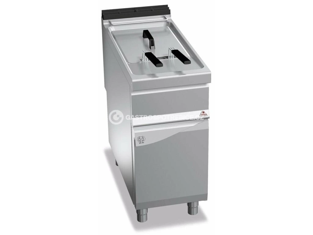 Topné těleso umístěné přímo ve vaně. Snažší čištění umožňuje odklopení topného tělesa směrem nahoru. Bezpečnostní zařízení pro přerušení napájení při odklopení spirály nahoru. Kontrola teploty termostatem od 80 °C až 190 °C s přesnějším zjišťování teploty díky senzorům umístěným ve vaně. Světelná signalizace ovládání s indikátorem teploty. Elektrické a plynové fritézy jsou vybaveny mechanickým, nebo nově elektronickým ovládáním s přesným řízením teploty. Technologie přímého ohřevu s vysokou účinností spirál zaručuje velmi rychlé nahřátí a rozvod tepla velkým povrchem zabraňujícím přepalování oleje. Nádrž se zaoblenými hranami a úchytem pro zavěšení koše poskytuje provozovateli maximum hygieny a pohodlí spojeného s bezpečím při práci. Provedení: elektrika Objem vany: 22 l Celkový příkon: 18 kWDoplňkové parametry