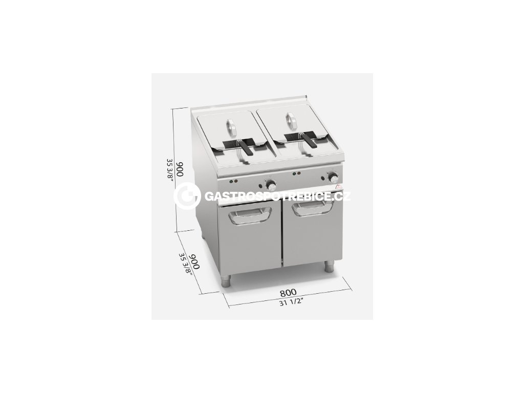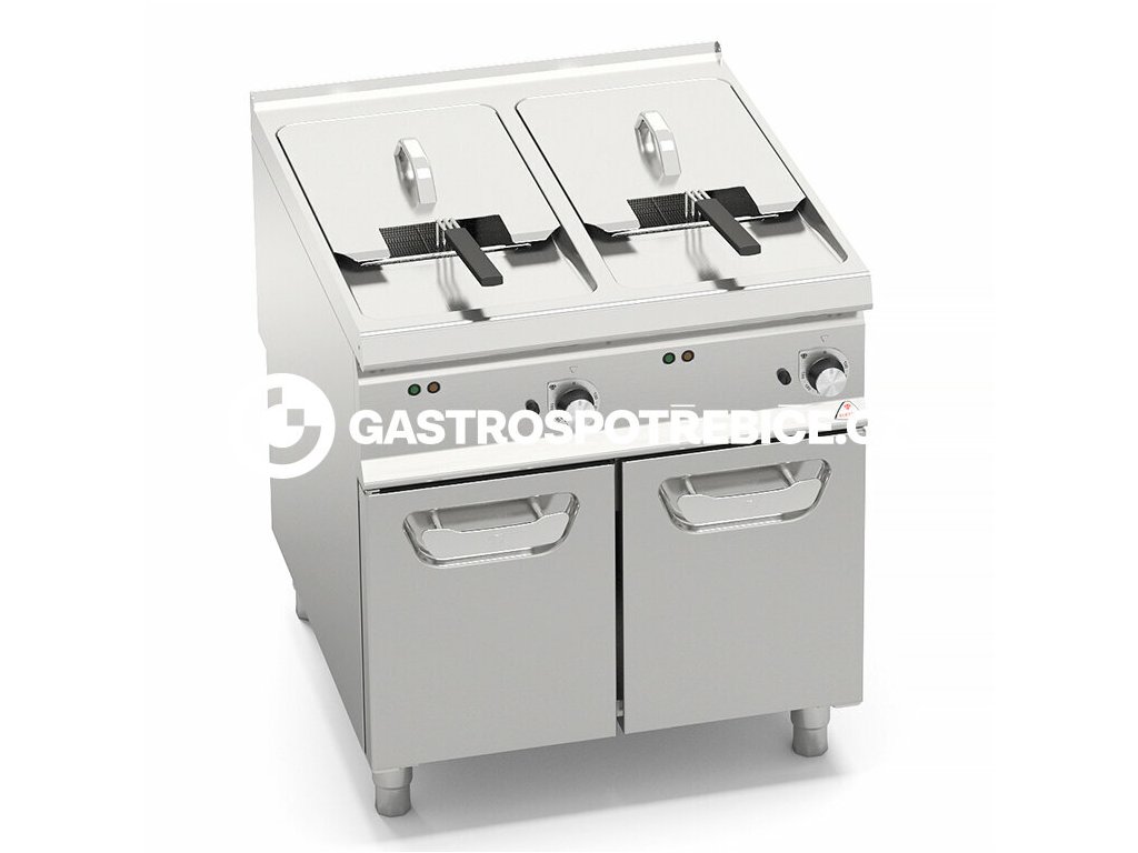 Dvě vany s nezávislým ovládáním pro optimální regulaci teploty. Topné těleso umístěné přímo ve vaně. Snazší čištění umožňuje odklopení topného tělesa směrem nahoru. Bezpečnostní zařízení pro přerušení napájení při odklopení spirály nahoru. Kontrola teploty termostatem od 80 °C až 190 °C s přesnějším zjišťování teploty díky senzorům umístěným ve vaně. Světelná signalizace ovládání s indikátorem teploty. Pracovní plocha z nerez oceli AISI 304 tloušťka 20/10, přední a boční panely z nerezové oceli AISI 304. Lisovaná vana z nerez oceli AISI 304 s oblýma hranama pro snadné čistění. Na pracovní desce umístěné ramínko pro napouštění vody ovládané kohoutem na čelního panelu s přepadem do nádrže. Vypouštění kulovým kohoutem s tepelně odolným držadlem. Hmotnost: 87 kg Příkon: 2 x 22 kW Obsah: 2 x 22 l Počet košů: 2 Počet van: 2Doplňkové parametry
