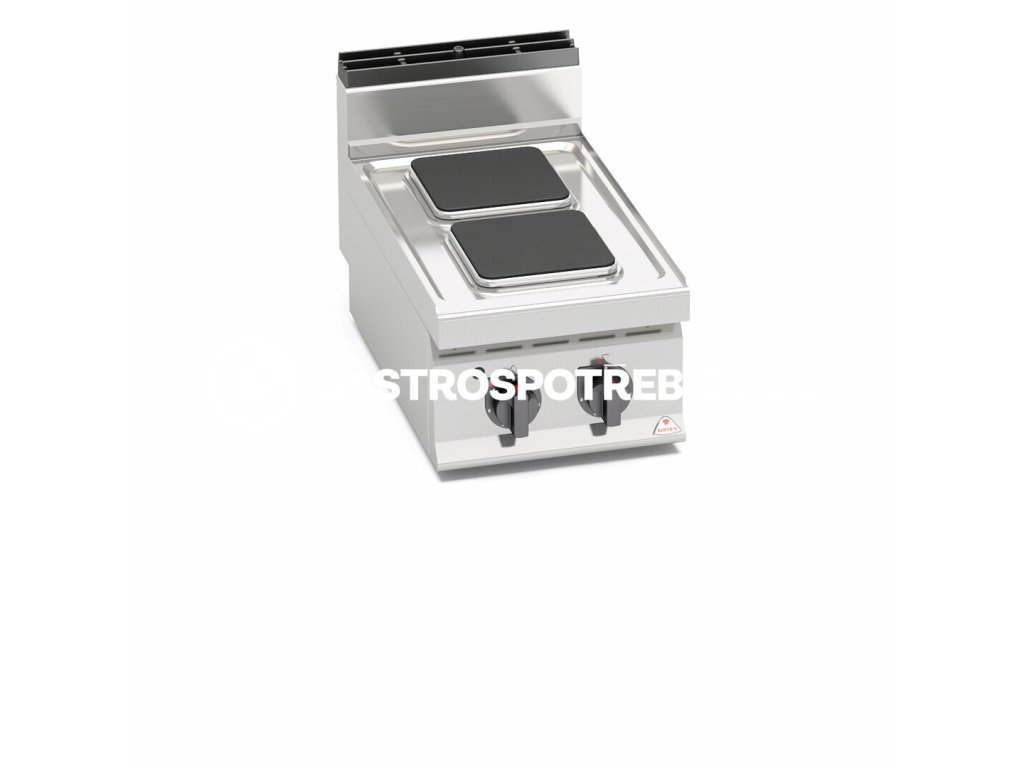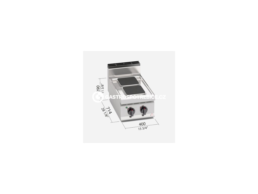 Sporák je vybaven varnými plotýnkami z litiny. Pracovní plochu lze doplnit o ocelovou výplň prostoru mezi plotnami, čímž se dosáhne celistvé pracovní plochy. Teplota je regulována nezávisle nastavitelnými spínači. Přímá kontrola teploty umožňuje významně uspořit energie. Topná tělesa jsou hermeticky uzavřena v jednom celku, který je lisován v rovině do varné desky. Pracovní plocha a opláštění z nerez oceli AISI 304. Litinová varné plotýnky s bezpečnostním termostatem a regulací výkonu. Provedení: elektrika Počet ploten: 2 Celkový příkon: 5,2 kWDoplňkové parametry