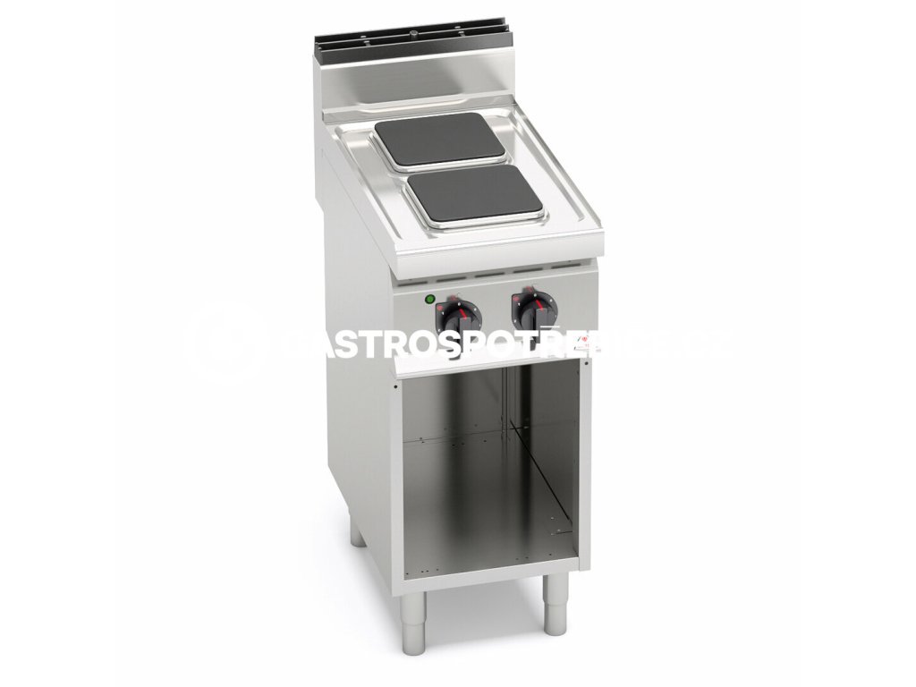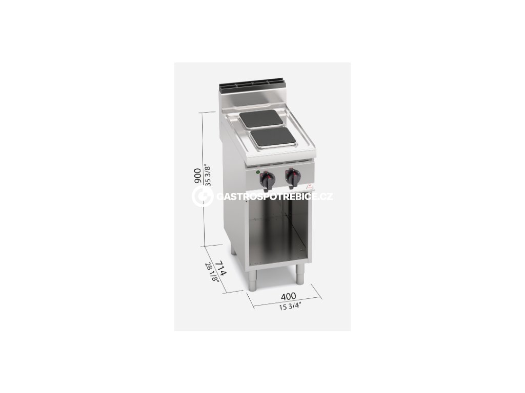 Sporák je vybaven varnými plotýnkami z litiny. Pracovní plochu lze doplnit o ocelovou výplň prostoru mezi plotnami, čímž se dosáhne celistvé pracovní plochy. Teplota je regulována nezávisle nastavitelnými spínači. Přímá kontrola teploty umožňuje významně uspořit energie. Topná tělesa jsou hermeticky uzavřena v jednom celku, který je lisován v rovině do varné desky. Pracovní plocha a opláštění z nerez oceli AISI 304. Litinová varné plotýnky s bezpečnostním termostatem a regulací výkonu. Kompaktní provedení s otevřeným podstavcem. Provedení: elektrika Počet ploten: 2 Celkový příkon: 5,2 kWDoplňkové parametry