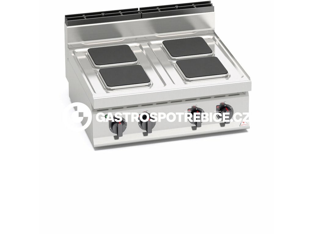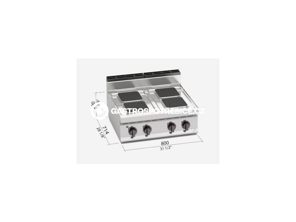 Sporák je vybaven varnými plotýnkami z litiny. Pracovní plochu lze doplnit o ocelovou výplň prostoru mezi plotnami, čímž se dosáhne celistvé pracovní plochy. Teplota je regulována nezávisle nastavitelnými spínači. Přímá kontrola teploty umožňuje významně uspořit energie. Topná tělesa jsou hermeticky uzavřena v jednom celku, který je lisován v rovině do varné desky. Pracovní plocha a opláštění z nerez oceli AISI 304. Litinová varné plotýnky s bezpečnostním termostatem a regulací výkonu. Kompaktní provedení s otevřeným podstavcem. Provedení: elektrika Počet ploten: 4 Celkový příkon: 10,4 kWDoplňkové parametry