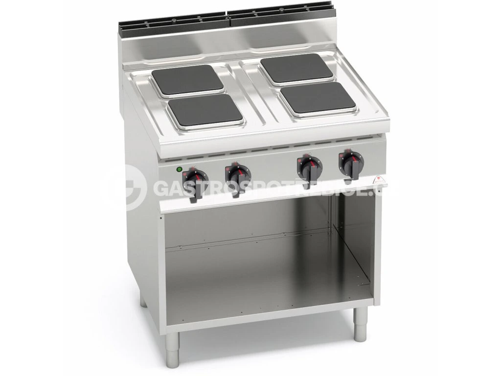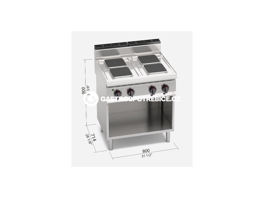 Sporák je vybaven varnými plotýnkami z litiny. Pracovní plochu lze doplnit o ocelovou výplň prostoru mezi plotnami, čímž se dosáhne celistvé pracovní plochy. Teplota je regulována nezávisle nastavitelnými spínači. Přímá kontrola teploty umožňuje významně uspořit energie. Topná tělesa jsou hermeticky uzavřena v jednom celku, který je lisován v rovině do varné desky. Pracovní plocha a opláštění z nerez oceli AISI 304. Litinová varné plotýnky s bezpečnostním termostatem a regulací výkonu. Kompaktní provedení s otevřeným podstavcem. Elektrické sporáky s optimálním varným výkonem 4x plotna - 2,6kW. Šest regulačních stupňů topného výkonu ploten, elektrická multifunkční trouba FE - statická pro GN 2/1 s ovládáním jednotlivých spodních a horních těles (4,5 + 3kW), nebo horkovzdušná trouba FE1 - ventilovaná pro GN 1/1. Sporáky jsou vyrobeny z kvalitní nerezové oceli AISI 304 se zaoblenými hranami pro bezpečnou práci a snadnou údržbu.Litinové varné plotny s bezpečnostním termostatem. Elektrická vařidla E7P4M a E7PQ4M v základu dovávána bez dvířek (viz. příslušenství - křídlová dvířka 2P).Doplňkové parametry