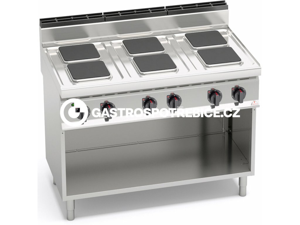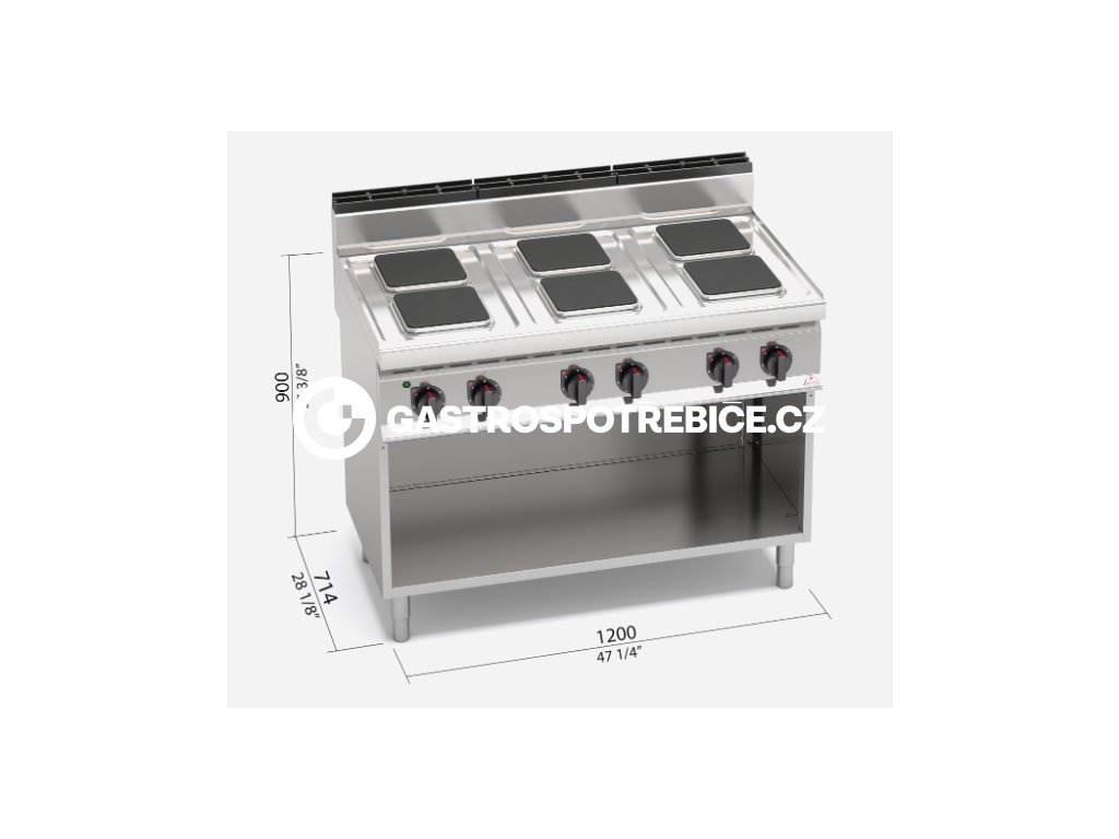 Sporák je vybaven varnými plotýnkami z litiny. Pracovní plochu lze doplnit o ocelovou výplň prostoru mezi plotnami, čímž se dosáhne celistvé pracovní plochy. Teplota je regulována nezávisle nastavitelnými spínači. Přímá kontrola teploty umožňuje významně uspořit energie. Topná tělesa jsou hermeticky uzavřena v jednom celku, který je lisován v rovině do varné desky. Pracovní plocha a opláštění z nerez oceli AISI 304. Litinová varné plotýnky s bezpečnostním termostatem a regulací výkonu. Kompaktní provedení s otevřeným podstavcem. Provedení: elektrika Počet ploten: 6 Celkový příkon: 15,6 kWDoplňkové parametry