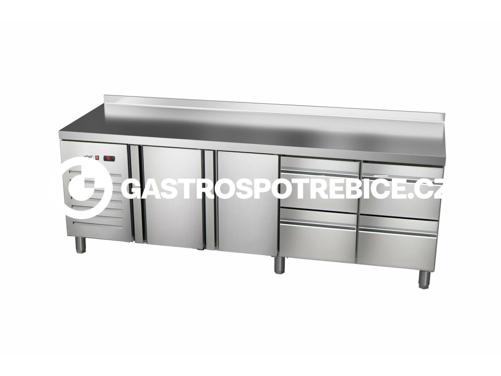Zesílená konstrukce Konstrukce o šířce 700 mm, speciálně vyrobená pro intenzivní profesionální aplikace, vyznačuje se velmi robustním designem s vysoce kvalitními materiály a perfektní povrchovou úpravou. Pracovní desky Robustní pracovní desky z nerezové oceli o tloušťce 50 mm se 100 mm vysokým zpětným dostřikem jako standardní volitelná výbava, která zabraňuje rozlití za pultem. Přizpůsobení je k dispozici v různých konfiguracích (bez stříkání, bez horní části, s dřezem a materiály (nerezová ocel, žula), aby se přizpůsobily jakýmkoli profesionálním kuchyňským potřebám. Izolace - tloušťka 50 mm Zaručuje výjimečnou, dlouhodobou izolaci a úsporu energie na každém pultu díky polyuretanové izolaci s vysokou hustotou (40 kg/m³) bez freonů, vstřikované pod vysokou tlak. Dveře s integrovaným madlem a odnímatelné těsnění Ergonomická, po celé délce, robustní, dokonale integrovaná rukojeť zajišťuje praktické otevírání dvířek a zabraňuje hromadění prachu a nečistot extrémně snadné čištění. Odnímatelné vytahovací/vtlačovací magnetické těsnění dveří pro zachování maximální hygieny a zachování izolačních vlastností. Výškově nastavitelná nerezová ocel nohy Smontované nohy z nerezové oceli jsou standardně dodávány. Výšku nožiček lze individuálně nastavit (125 mm - 200 mm), aby bylo možné pohodlně čistit pod spotřebičem. Volitelně jsou k dispozici kolečka. Teleskopický posuv z nerezové oceli šuplíky Zásuvky z nerezové oceli s děrovanými spodními deskami a teleskopickými posuvnými vodítky, které lze zcela zasunout pro úsporu pracovní plochy. Odnímatelné vodicí lišty, robustní drátěné mřížky Odnímatelné vodicí lišty umožňují pohodlnější čištění bez použití dalších nástrojů. Umístění a nastavení drátěných mřížek v požadované výšce je možné bez použití přídavných kolejnic. Drátěné mřížky potažené epoxidem pro zlepšení ochrany umožňují skladování různých typů obalů a mají maximální nosnost až 40 kg. Intuitivní digitální ovládání Teplotní parametry se nastavují snadno a rychle, což umožňuje nejvyšší kvalitu a nejlepší uchování potravin. Vysoce účinné komponenty Nízkoenergetické kompresory, velkoplošné výparníky a vysoce výkonné elektronické ventilátory, které minimalizují teplotní zisky a snižují spotřebu energie. Chlazená vestavěná přísada kontejnery Optimální cirkulace vzduchu ve vnitřním těle zajišťuje, že gastronorm pultové nádoby na přísady jsou nepřetržitě chlazeny, takže jsou ideální jako pracovní stanice pro přípravu salátů, sendvičů a pizz. Automatické odpařování odmrazování voda Horký plyn vycházející z kompresoru se používá k automatickému odpařování rozmrazené vody namísto pomocí topných těles, čímž se dosahuje ještě nižší spotřeby energie. Díky tomu potraviny nepodléhají škodlivým teplotním výkyvům. Dálkové čítače Široká škála modelů bez kondenzační jednotky pro minimalizaci emisí tepla a hluku zaručuje bezpečnější pracovní prostředí v profesionálních kuchyních.Doplňkové parametry
