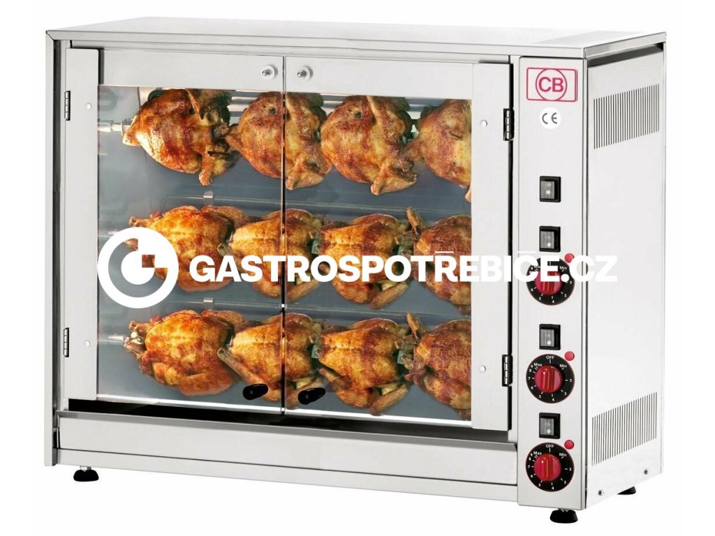 Elektrický gril na kuřata E-12P-S3. celonerezové provedení ovládání jednotlivých jehel prosklená přední dvířka vnitřní osvětlení spodní odkapová miska Ve standardu základní špízy na grilování kuřat. Příplatkově možno dodat náhradní jehly, koše a spony dle vyobrazeného příslušenství. Materiál: nerez Počet jehel: 3 Vsádka kuřat: až 12Doplňkové parametry