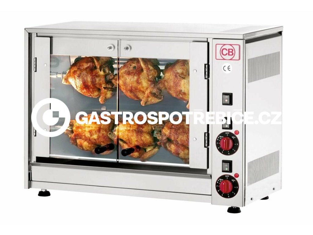 Elektrický gril na kuřata E-6 P. celonerezové provedení ovládání jednotlivých jehel prosklená přední dvířka vnitřní osvětlení spodní odkapová miska Ve standardu základní špízy na grilování kuřat. Příplatkově možno dodat náhradní jehly, koše a spony dle vyobrazeného příslušenství. Materiál: nerez Počet jehel: 2 Vsádka kuřat: až 6Doplňkové parametry