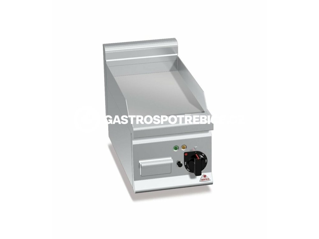 Topné těleso s vyšším výkonem je umístěno pod grilovací plotnou. Deska o velké tloušťce s hladkým (rýhovaným) povrchem z oceli a zvýšenými postranními lemy. Kompletní sortiment plynových a elektrických ploten s různým provedením grilovací plochy. Lze na nich připravovat pokrmy tzv. "kontaktem" a to nejcitlivějším způsobem. Jednotný systém distribuce tepla zaručuje rovnoměrné grilování po celé pracovní ploše. Při grilování se přirozeně tvoří zbytkový olej, který je odváděn a shromažďován ve velké odpadní nádobce. Provedení: elektrika Příkon: 4kW Povrch desky: ocel Rozměr plotny: 296 x 430 mmDoplňkové parametry