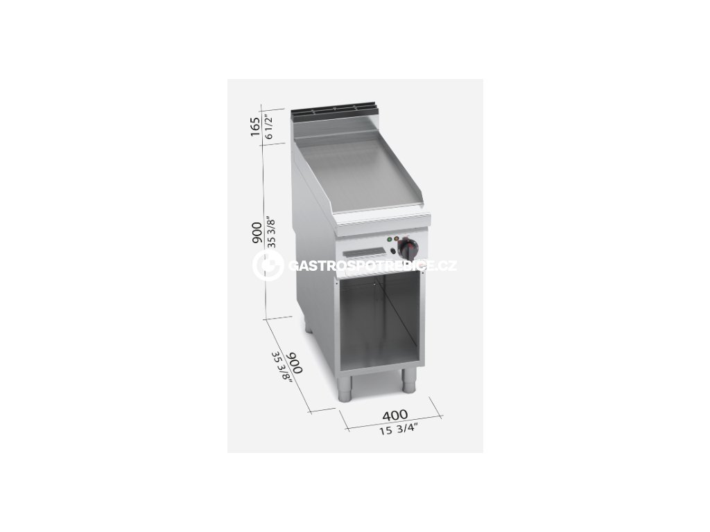 Topné těleso je umístěno pod grilovací plotnou. Deska o velké tloušťce s hladkým (rýhovaným) povrchem z oceli a zvýšenými postranními lemy. Kompaktní provedení s otevřeným podstavcem. Kompletní sortiment plynových a elektrických ploten s různým provedením grilovací plochy. Lze na nich připravovat pokrmy tzv. "kontaktem" a to nejcitlivějším způsobem. Jednotný systém distribuce tepla zaručuje rovnoměrné grilování po celé pracovní ploše, velké energetické úspory a zlepšení pracovního prostředí. Při grilování se přirozeně tvoří zbytkový olej, který je odváděna shromažďován ve velké odpadní nádobce. Provedení: elektrika Povrch desky: ocel Rozměr plotny: 390 x 660 mmDoplňkové parametry