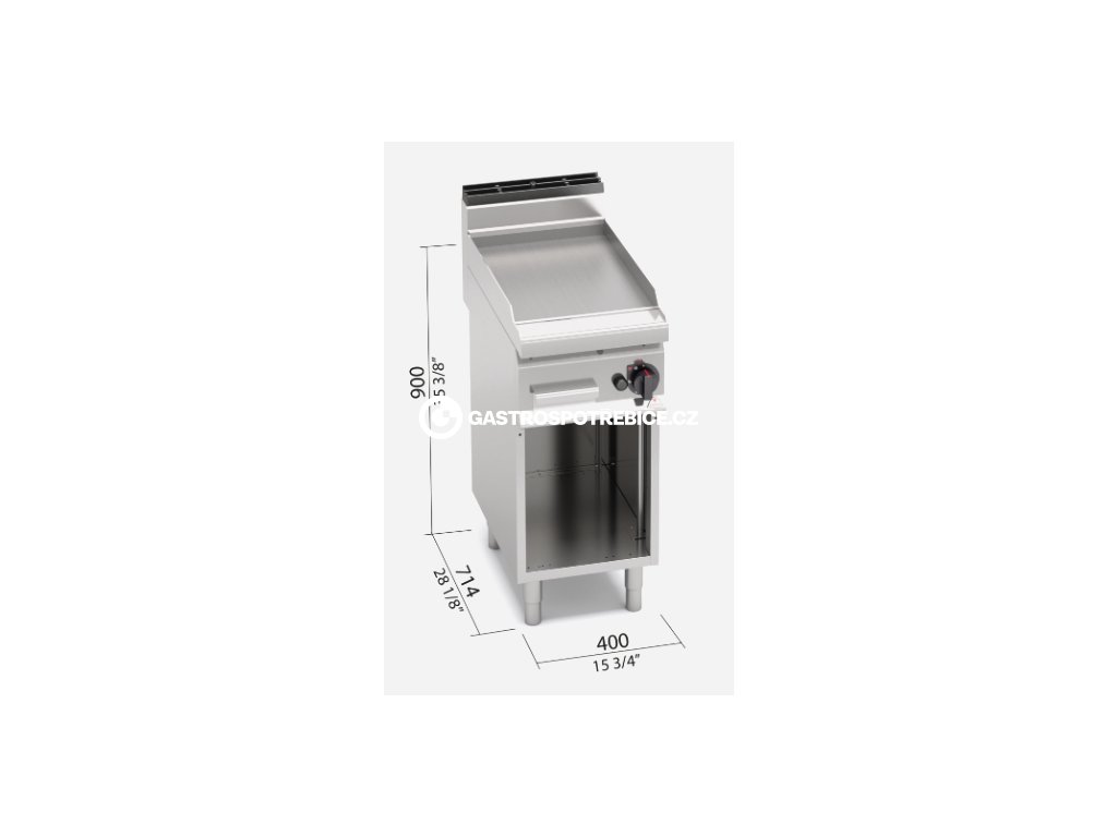 Termostatický ventil do 300°C pro přesnou a bezpečnou regulaci. Deska s hladkým (rýhovaným) povrchem z oceli a zvýšenými postranními lemy. Kompletní sortiment plynových a elektrických ploten Bertos s různým provedením grilovací plochy. Lze na nich připravovat pokrmy tzv. "kontaktem" a to nejcitlivějším způsobem. Jednotný systém distribuce tepla zaručuje rovnoměrné grilování po celé pracovní ploše, velké energetické úspory a zlepšení pracovního prostředí. Při grilování se přirozeně tvoří zbytkový olej, který je odváděna shromažďován ve velké odpadní nádobce. Grilovací desky vyrobeny z nerezové oceli AISI 304. Rovnoměrné rozložení tepla je zajišťují výkonná topná tělesa a plynové hořáky umístěny pod grilovací deskou. Teplotní rozsah 50-270°C elektrické modely, plynové modely regulace výkonu do 300°C. Modely šířky 800mm mají nezávisle ovládání obou zón pro oddělené a šetrné vaření. Mírně nakloněná grilovací deska umožňuje samovolný odtok nežádoucí kapaliny odpadním otvorem do sběrné zásuvky. Provedení grilu s otevřeným podstavcem (příplatkově s dvířky 1P DX nebo 2P400). Širší nabídka (deska- hladká FL / rýhovaná FR / dělená FM / chromovaná CR a popř.vyšší výkon) na vyžádání.Doplňkové parametry