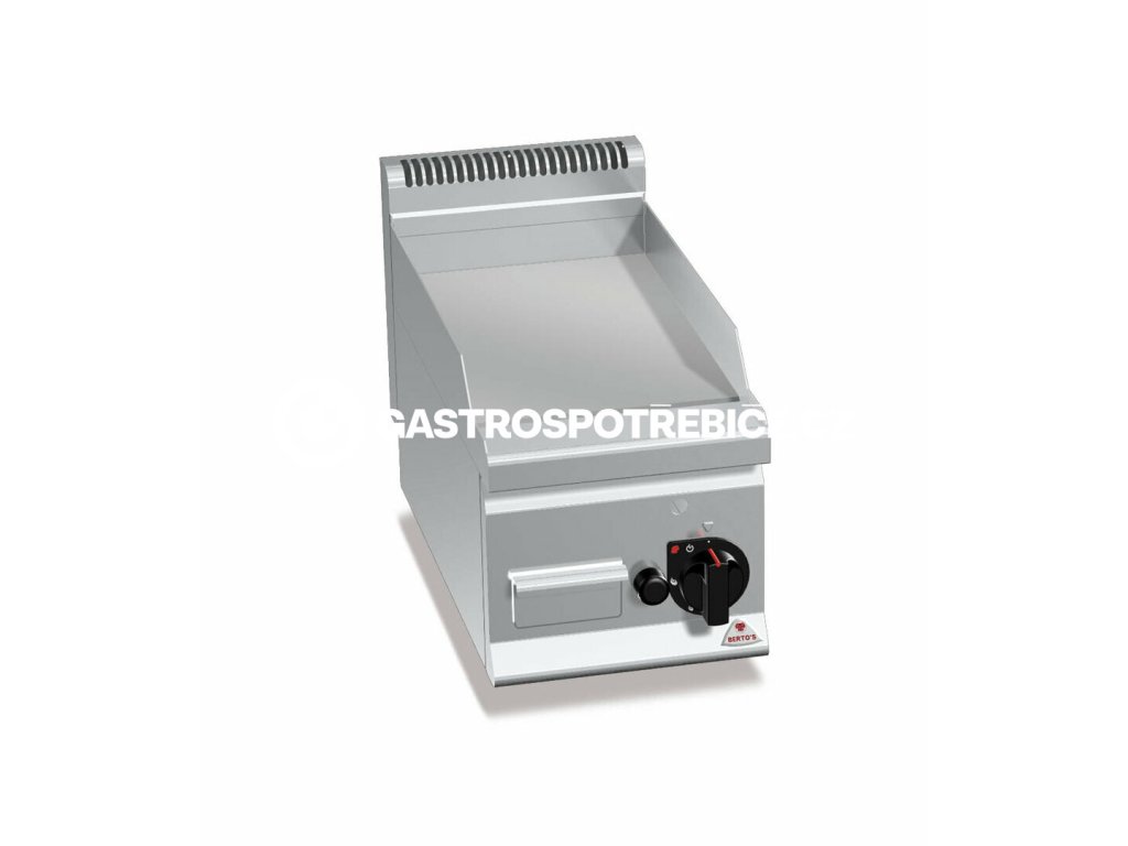 Termostatický ventil 30 až 300°C pro přesnou a bezpečnou regulaci. Termočlánek a chráněný zápalný plamínek. Deska hladká s vrstvou tvrdého chromu jež usnadňuje čistění, zvýšené postranní lemy. Kompletní sortiment plynových a elektrických ploten s různým provedením grilovací plochy. Lze na nich připravovat pokrmy tzv. "kontaktem" a to nejcitlivějším způsobem. Jenotný systém distribuce tepla zaručuje rovnoměrné grilování po celé pracovní ploše. Při grilování se přirozeně tvoří zbytkový olej, který je odváděn a shromažďován ve velké odpadní nádobce. Provedení: plyn Příkon: 4kW Povrch desky: chrom Rozměr plotny: 296 x 430 mmDoplňkové parametry