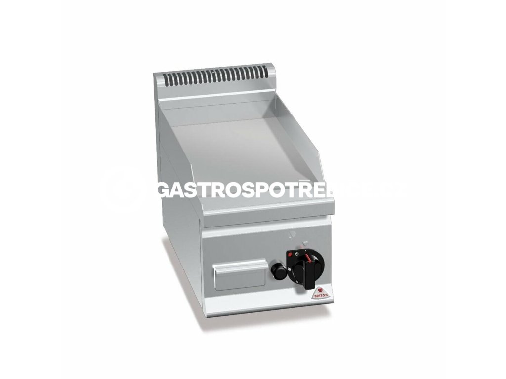 Termostatický ventil 30 až 300°C pro přesnou a bezpečnou regulaci. Termočlánek a chráněný zápalný plamínek. Deska s hladkým (rýhovaným) povrchem z oceli a zvýšenými postranními lemy. Kompletní sortiment plynových a elektrických ploten s různým provedením grilovací plochy. Lze na nich připravovat pokrmy tzv. "kontaktem" a to nejcitlivějším způsobem. Jenotný systém distribuce tepla zaručuje rovnoměrné grilování po celé pracovní ploše. Při grilování se přirozeně tvoří zbytkový olej, který je odváděn a shromažďován ve velké odpadní nádobce. Provedení: plyn Příkon: 4kW Povrch desky: ocel Rozměr plotny: 296 x 430 mmDoplňkové parametry