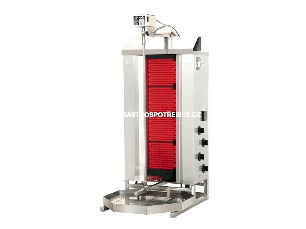 Elektrický gril na gyros, model CE4 od Německé firmy POTIS. Kapacita 70kg. Model CE4 má pohon jehly umístěn nahoře a je osazen tepelným krytem motoru. Posuv vzdálenosti motoru, jehly a naklánění jehly umožňuje lépe regulovat teplotu v jednotlivých úrovních tepelně opracovávaného produktu. Nové sklokeramické krytí těles ROBAX Ceramic Glass (snadná údržba a prodloužení životnosti topných spirál). Materiál: nerez Max kapacita: 70 kg Počet topných těles: 4 Ke grilům je možno přiobjednat nože na gyros, lopatky a elektrické nože.Doplňkové parametry