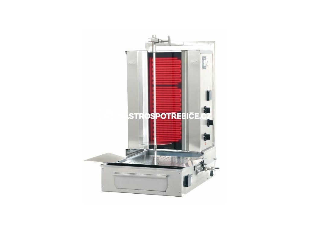 Elektrický gril na gyros, model CE3 F od Německé firmy POTIS. Kapacita 40kg. Model CE3 F má pohon jehly dole (bezpečně zabudován v opláštěném podstavci vybaveném vyjímatelnou zásuvkou) s možností posuvu a fixace. Posuv vzdálenosti těles a naklánění jehly umožňuje lépe regulovat teplotu v jednotlivých úrovních tepelně opracovávaného produktu. Nové sklokeramické krytí těles ROBAX Ceramic Glass (snadná údržba a prodloužení životnosti topných spirál). Materiál: nerez Max kapacita: 40 kg Počet topných těles: 3 Ke grilům je možno přiobjednat nože na gyros, lopatky a elektrické nože.Doplňkové parametry