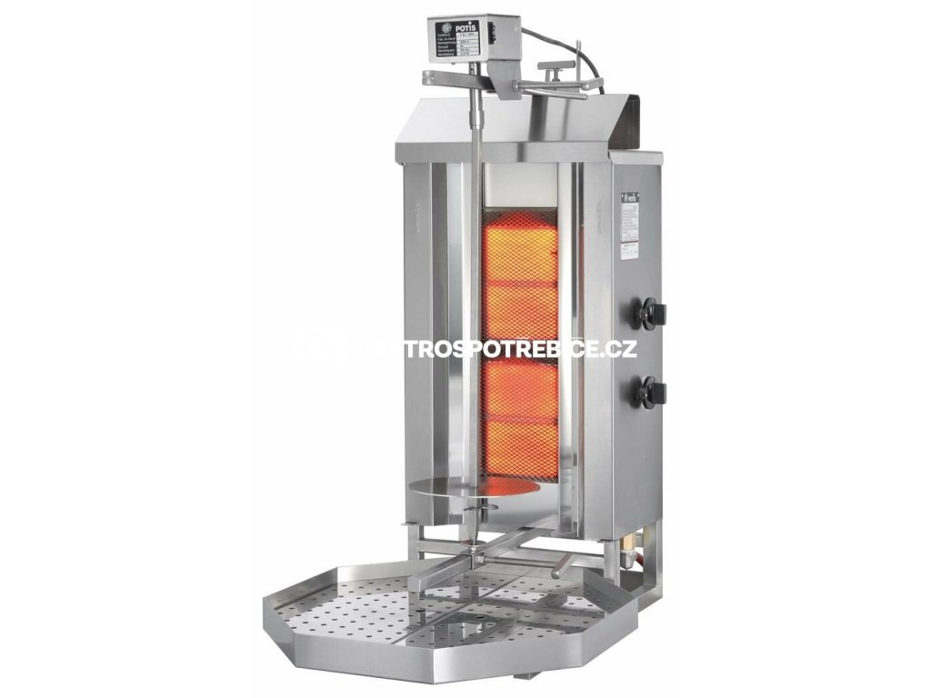 Plynový gril na gyros, model GD2/S od Německé firmy POTIS. Kapacita 30kg. Model GD2/S má pohon jehly umístěn nahoře a jsou osazeny tepelným krytem motoru. Posuv vzdálenosti motoru, jehly a naklánění jehly umožňuje lépe regulovat teplotu v jednotlivých úrovních tepelně opracovávaného produktu. Provedení: nerezové Rozměry jsou uvedeny včetně ovladačů a motoru Gyros grily v provedení s motorem nahoře méně namáhaný a lepe chlazený motorek zabráněno zanášením tukem a krytem před žárem delší životnost a snadná výměna motorku Materiál: nerez Max kapacita: 30 kg Typ hořáku/počet: dvojitý / 2x Ke grilům je možno přiobjednat nože na gyros, lopatky a elektrické nože.Doplňkové parametry
