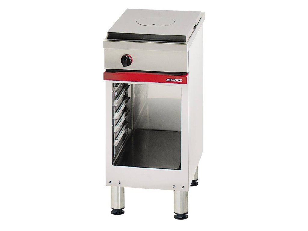 Samostatný plynový hořák CMG 410 CF od francouzského výrobce AMBASSADE DE BOURGOGNE. 1litinový tál – 400×500 mm hořák 5 kW sestava je složena z vrchního modulu a skříňky na stavitelných nohách elektrické zapalování termopojistka otevřený prostor skříňky Volitelné příslušenství: grilovací deska hladká grilovací deska vroubkovaná podstavec pro wok pánev, pro hořák 5 kW roštová police dvířka CPM vodící lišty ECH možná úprava neutrální skříňky na vyhřívanou OAC 400 – topné těleso 1 kW, 230 V, dodávána vč. lišt a dvířek s vnitřní izolacíDoplňkové parametry