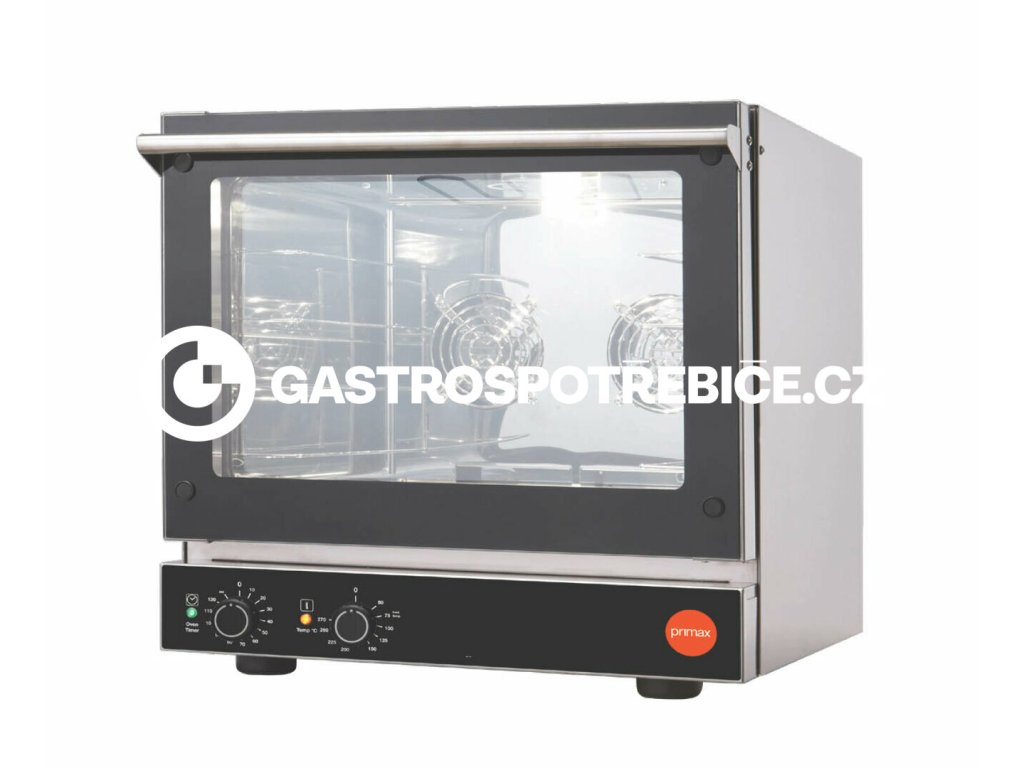 Pekařská a cukrářská pec Fast Value FV-CME404-HR Pekařské a cukrářské pece předního Italského výrobce firmy Primax jsou vyrobeny v Itálii z evropských komponentů a kvalitní nerezových materiálů, sestaveny pod přísnou kontrolou v moderním funkčním designu. Pece FAST jsou ideálním řešením pro lehčí provozy k přípravě čerstvého, nebo zmraženého pečiva a dalších produktů. Pece jsou ideální pro kavárny, bary, rychlá občerstvení, čerpací stanice, plovárny. Celonerezové provedení AISI 430 (304), izolovaná komora (keramická vlákna), varný prostor se zaoblenými hranami a lisovaným dnem. Snadné manuální ovládání s nastavení teploty 50°- 270°C, nastavením času 0 - 120 min. a trvalý chod (nekonečno). Dostatečný výkon a prodění vzduchu zajišťují dva výkonné ventilátory a nerezová výkonná tělesa Incoloy 800, vnitřní osvětlení komory. Snadno vyjímatelné těsnění varné komory. Odvětrávaná výklopná dvířka s dvojitým sklem a nerezovým bezpečné umístěným madlem. Nerez vyjímatelné zásuvy s roztečí 70 mm. Celonerezové provedení AISI (430/304) varný prostor se zaoblenými hranami a lisovaným dnem izolovaná komory (keramická vlákna) snadné mechanické ovládání nastavení teploty 0-270°C nastavení času 0-120min + nekonečno dva výkonné reverzní ventilátory vnitřní halogenové osvětlení snadno vyjímatelné těsnění varné komory odvětrávaná výklopná dvířka s dvojitým sklem nerez vyjímatelné zásuvy s roztečí 70mm kapacita komory pro 4 plechy 460x340 (na objednávku model se zásuvy pro GN2/3) Kapacita 4x plech 460x340mm Ventilovaný ohřev (dva ventilátory) Příkon : 3,2 kW Napětí: 230VDoplňkové parametry