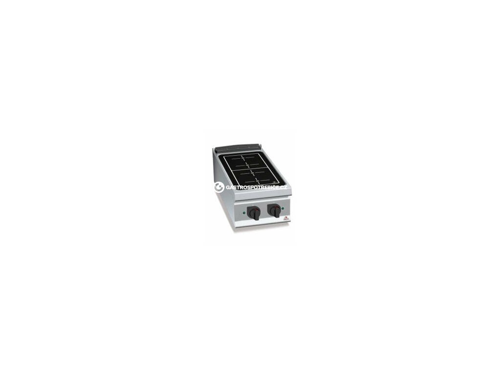 Indukční keramická varná deska, (obdelníková varná deska pracující přes dvě zóny) tloušťka 6 mm (snadná každodenní údržba bez použití abrasivních prostředků). Maximální úspora energie, vytápění jednotlivých varných ploch (270x310 mm) je pouze při kontaktu hrnce s varnou plochou. Velikost topných zón je samo-regulovana podle průměru nádobí. Při odstranění nádobí z povrchu je automaticky přerušeno vytápění. Elektronická regulace teploty potenciometrem. Model TOUCH s dotykovým elektronickým ovládáním.Doplňkové parametry