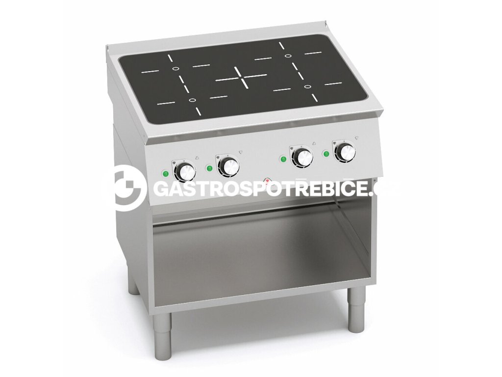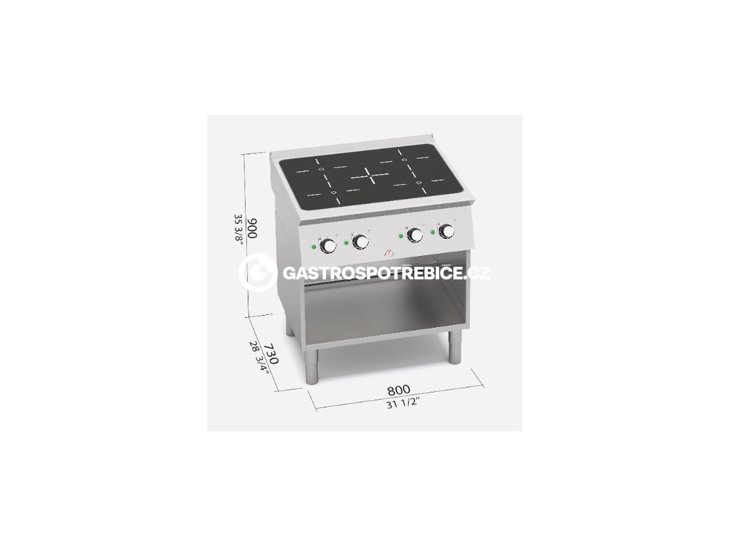 Keramická varná deska, tloušťka 6 mm (snadná každodenní údržba bez použití agrasivních prostředků). Maximální úspora energie, vytápění varné plochy je pouze při kontaktu hrnce s varnou plochou. Velikost topných zón je samo-regulovana podle průměru nádobí. Při odstranění nádobí z povrchu je automaticky přerušeno vytápění. Elektronická regulace teploty je prováděna potenciometrem. Kompaktní provedení s otevřeným podstavcem. Model TOUCH s dotykovým elektronickým ovládáním. Pracovní deska z kvalitní nerez oceli AISI 304 tloušťka 2 mm (20/1), přední a boční opláštění z nerezové oceli AISI 304. Termostatický ventil 30 až 300°C pro přesnou a bezpečnou regulaci. Termočlánek a chráněný zápalný plamínek. Dvojvrstvá grilovací plotna (umístěná v prolisované zesílené pracovní desce, tloušťka 2 mm, vybavena odtokovým otvorem) složená z ocelového plátu a horní vrstvy z nerez oceli AISI 316 s leštěným povrchem, který umožňuje snadné čištění. Nízká úroveň odlesku zvyšuje komfort při práci. Příkon: 4 x 3,5 kW Počet zón: 4 Hmotnost: 70 kgDoplňkové parametry