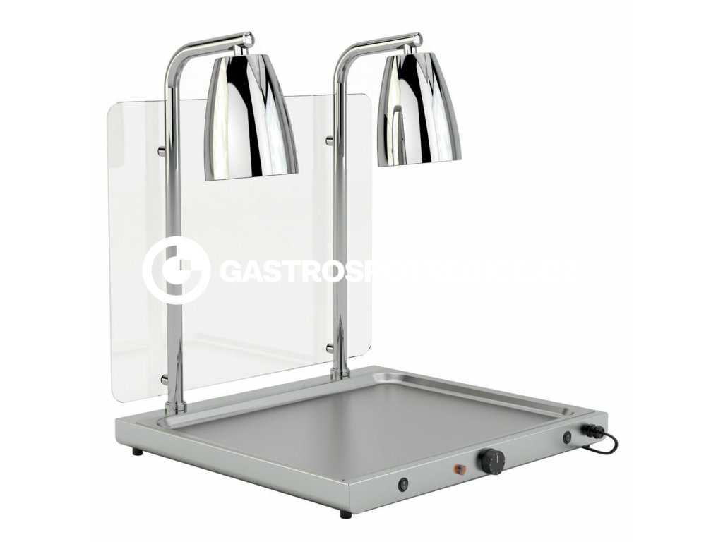 Infra pracovní stanice se spodní prolisovanou ohřevnou deskou v nerez provedení AISI 304, kterou lze použít samostatně nebo s příplatkovou žulovou pracovní deskou (dekor LAVA nebo OXIDE). Plexi hygienický zákryt. Regulace teploty desky +30° až +90 °C (750 W). Infra červené lampy (2 x 250 W) umístěny na ramenech s kulovým kloubem a nezávislým spínačem osvětlení každé. V balení je 2 ks infra žárovek 250 W.Doplňkové parametry