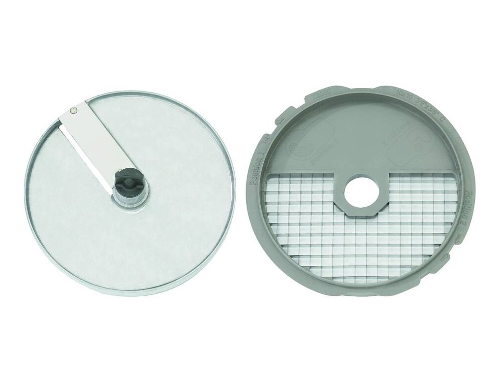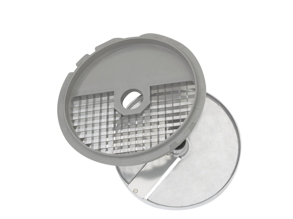 Kostičkovač 10×10×10 mm s povrchovou úpravou Mineral + vysoká odolnost zachování čerstvosti optimální ochrana povrchu disku snižuje se tření disku snadné čištění (lze mýt v myčce nádobí, ale pozor na ztupení břitů) Určený pro modely: CL 30 Bistro, CL 40, R 402 Dodáváno jako komplet složený ze dvou disků: plátkovač, mřížka. !!!Tento disk je určený pro zařízení se zeleným vyhazovacím diskem 104964S!!!