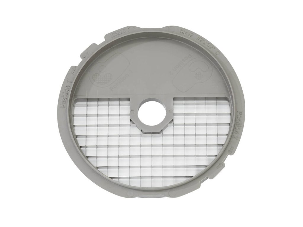 Kostičkovač 12×12×12 mm s povrchovou úpravou Mineral + vysoká odolnost zachování čerstvosti optimální ochrana povrchu disku snižuje se tření disku snadné čištění (lze mýt v myčce nádobí, ale pozor na ztupení břitů) Určený pro modely: CL 30 BISTRO, CL 40, R 402 Dodáváno jako komplet složený ze dvou disků: plátkovač, mřížka. !!!Tento disk je určený pro zařízení se zeleným vyhazovacím diskem 104964S!!!