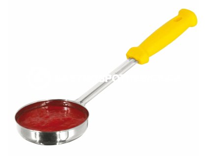 Nerezová masivní lžíce na sos s plastovou rukojetí je dodávána ve dvou kapacitách 90 a 220g.