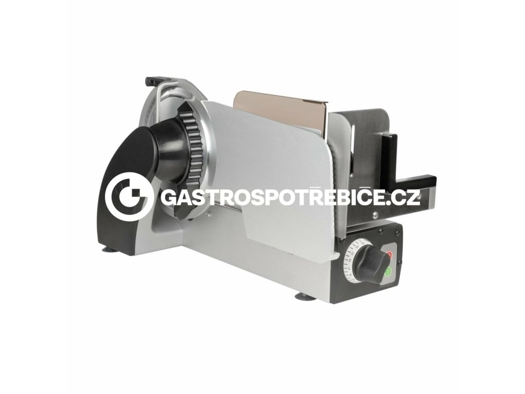Nářezový stroj manuální pro profesionální použití na porcování a krájení různých produkt (uzeniny, maso, sýr, chléb, zeleninu a ovoce). Vhodný pro gastronomické provozy a menší prodejny. Opravdový multitalent se šírokým spektrem využití. Promyšlená konstrukce stroje zabezpečí nejlepší výsledky krájení, optimální přístup a komfort při čistění. Vysoký hygienický standard. Účinný systém chlazení motoru a hybridní pohon (šneková převodovka pohánějící klínový řemen) umožňuje efektivní a bezúdržbový přenos energie i při nepřetržitém provozu. Důmyslný "L" design umožňuje šikovnou kombinaci a těsné seskupení s úložnými tácky, krájecími deskami, nebo s váhou atd. Maximální řezná kapacita s minimální stopou, přesné a praktické nastavení tloušťky řezu od 0 až do 20mm. Vertikální provedení nářezového stroje, barva odolných plastů : černá (standardní), na objednávku v barvě (červená,bílá) Nůž hladký CERA 3 Ø250 mm - nepřilnavý, odolný povrch vhodný pro krájení uzeniny a sýrů Model s prodlouženým vozíkem (300mm) Pohon nářezového stroje zajišťuje výkonný 300 W motor (tichý, účinný, dobře chlazený hybridní pohon (šneková převodovka pohánějící klínový řemen) umožňuje efektivní a bezúdržbový přenos energie i při nepřetržitém provozu) Součástí stroje je zařízení na broušení nože.Doplňkové parametry