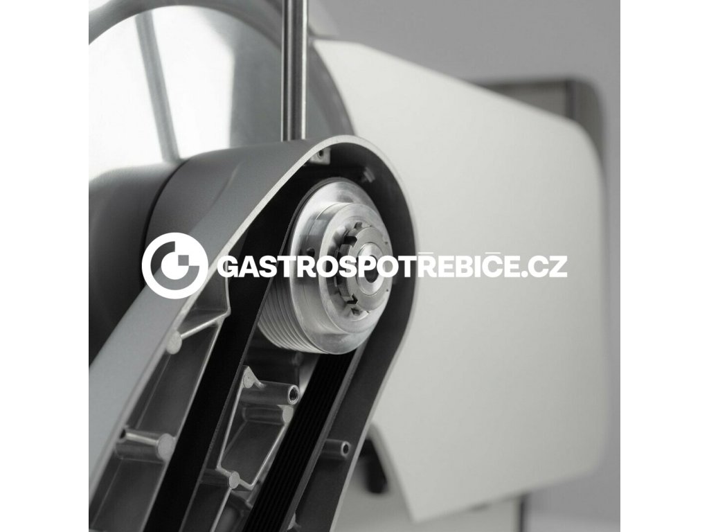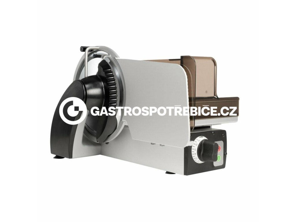 Nářezový stroj manuální pro profesionální použití na porcování a krájení různých produkt (uzeniny, maso, sýr, chléb, zeleninu a ovoce). Vhodný pro gastronomické provozy a menší prodejny. Opravdový multitalent se šírokým spektrem využití. Promyšlená konstrukce stroje zabezpečí nejlepší výsledky krájení, optimální přístup a komfort při čistění. Vysoký hygienický standard. Účinný systém chlazení motoru a hybridní pohon (šneková převodovka pohánějící klínový řemen) umožňuje efektivní a bezúdržbový přenos energie i při nepřetržitém provozu. Důmyslný "L" design umožňuje šikovnou kombinaci a těsné seskupení s úložnými tácky, krájecími deskami, nebo s váhou atd. Maximální řezná kapacita s minimální stopou, přesné a praktické nastavení tloušťky řezu od 0 až do 20mm. Vertikální provedení nářezového stroje, barva odolných plastů : černá (standardní), na objednávku v barvě (červená,bílá) Nůž hladký, ocelový Ø 300 mm - vhodný pro krájení uzeniny Pohon nářezového stroje zajišťuje výkonný 300 W motor (tichý, účinný, dobře chlazený hybridní pohon (šneková převodovka pohánějící klínový řemen) umožňuje efektivní a bezúdržbový přenos energie i při nepřetržitém provozu) Součástí stroje je zařízení na broušení nože.Doplňkové parametry