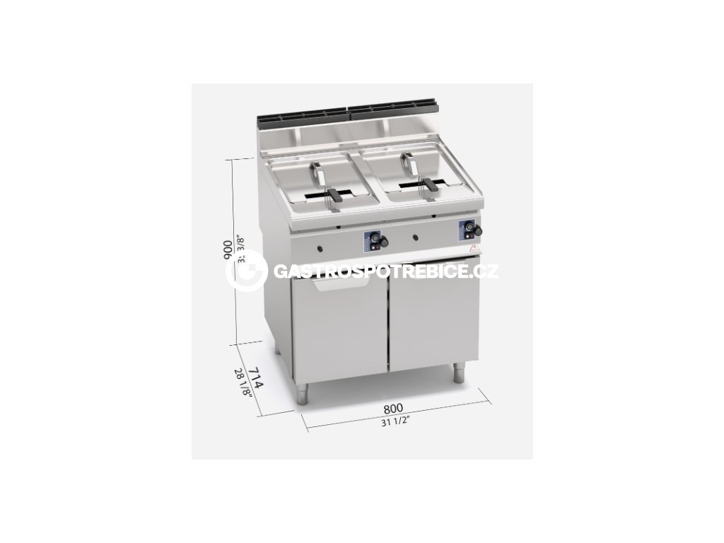Ovládání teploty termostatickým ventilem od 110°C do 190°C s přesným zjišťováním teploty díky senzorům ve vaně. Bezpečnostní termostat s manuálním restartem. Vypouštění kulovým kohoutem s tepelně odolným držadlem. Kompaktní provedení s uzavřeným podstavcem. Elektrické a plynové fritézy jsou vybaveny mechanickým ovládáním s přesným řízením teploty. Technologie přímého ohřevu s vysokou účinností hořáků a topných spirál zaručuje velmi rychlé nahřátí a rozvod tepla velkým povrchem zabraňujícím přepalování oleje. Nádrž se zaoblenými hranami a úchytem pro zavěšení koše poskytuje provozovateli maximum hygieny a pohodlí spojeného s bezpečím při práci. Výklopná elektrická topná tělesa umožňují snadnou údržbu a čistění vany. Elektrické a plynové fritézy z nerez oceli AISI 304. Jedna nebo dvě lisované vany se studenou zónou pro zachycení zbytků jídel. Přímý ohřev trubkovými hořáky ve vaně nebo elektrickými topnými spirálami, vybaveny bezpečnostní termostaty. Plynulé nastavení výkonu, nebo teploty do 190°C. Teoretický výkon 1 vana (plynová fritéza 12 kg/h a elektrická 25 kg/h). Dodáváno s křídlovými dvířky a jedním základním košem/vana (Příplatkově: VYŠŠÍ VÝKON U ELEKTRICKÝCH MODELŮ 9 kW/2x 9kW, C2 = 2koše/vana)Doplňkové parametry