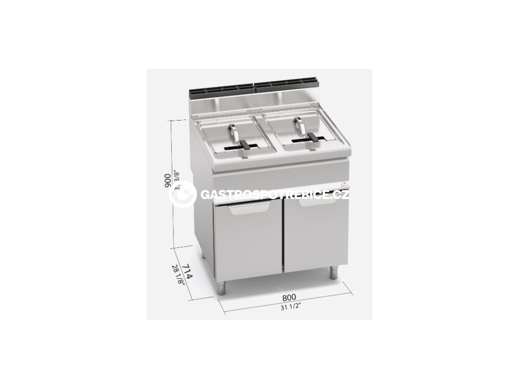 Ovládání teploty termostatickým ventilem od 110°C do 190°C s přesným zjišťováním teploty díky senzorům ve vaně. Bezpečnostní termostat s manuálním restartem. Vypouštění kulovým kohoutem s tepelně odolným držadlem. Kompaktní provedení s uzavřeným podstavcem. Elektrické a plynové fritézy jsou vybaveny mechanickým ovládáním s přesným řízením teploty. Technologie přímého ohřevu s vysokou účinností hořáků a topných spirál zaručuje velmi rychlé nahřátí a rozvod tepla velkým povrchem zabraňujícím přepalování oleje. Nádrž se zaoblenými hranami a úchytem pro zavěšení koše poskytuje provozovateli maximum hygieny a pohodlí spojeného s bezpečím při práci. Výklopná elektrická topná tělesa umožňují snadnou údržbu a čistění vany. Elektrické a plynové fritézy z nerez oceli AISI 304. Jedna nebo dvě lisované vany se studenou zónou pro zachycení zbytků jídel. Přímý ohřev trubkovými hořáky ve vaně nebo elektrickými topnými spirálami, vybaveny bezpečnostní termostaty. Plynulé nastavení výkonu, nebo teploty do 190°C. Teoretický výkon 1 vana (plynová frytéza 25 kg/h). Dodáváno s křídlovými dvířky a jedním základním košem/vana.Doplňkové parametry