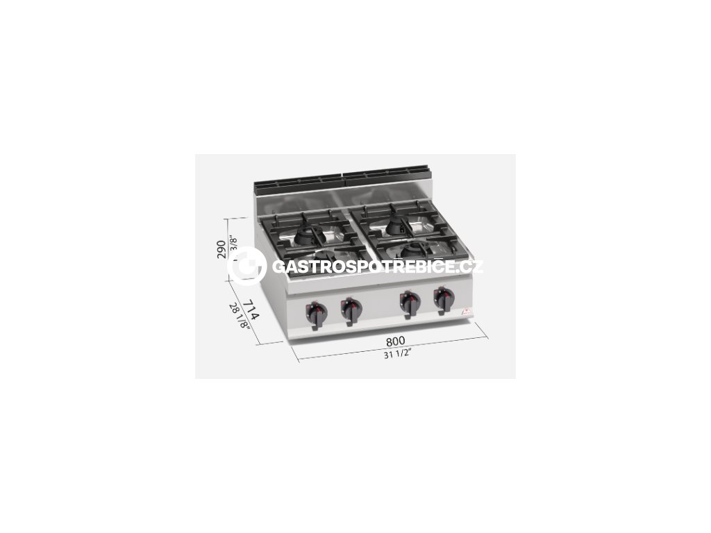 Příprava jídel přímo na plameni je u všech kuchařů nezbytná pro zdůraznění tradičních kulinářských dovedností. Tvar litinových roštů tvoří optimální pracovní plochu pro snadnou manipulaci s nádobím. Silné litinové hořáky 7 kW zaručují nadstandardní výkon a životnost. Vysoká energetická účinnost plynových hořáků umožňuje uspořit nejméně 30% plynu ročně v porovnání s tradičními hořáky. Odkapové vaničky pod hořáky mají zaoblené hrany, jsou kompletně odnímatelné. Vše je navrženo tak, aby byla snadná údržba a čištění. Pracovní plocha a opláštění z nerez oceli AISI 304. Výkonné litinové hořáky HIGH POWER, snadno demontovatelné a umístěné ve vyjímatelných prolisovaných smaltovaných (nerezových) odkapových vanách. Zapalování hořáků věčným plamínkem. Provedení: plyn Počet hořáků: 4 Celkový příkon: 28 kWDoplňkové parametry