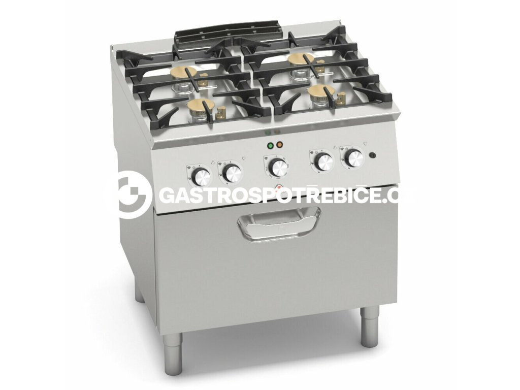 Nové výkonné sporáky linie HIGH POWER vyrobeny z odolné nerez oceli AISI 304. Profesionální poniklované litinové hořáky s vnitřním a vnějším hořením, snadno demontovatelné umístěny v prolisované nerezové vaně vybavené výpustí. Možnost napuštění vody kolem hořáků (snadné a rychlé čištění vypuštěním znečištěné vody). Hořáky s bezpečnostním termočlánkem, zapalovány věčným plamínkem. Kompaktní provedení s otevřeným podstavcem. Kompaktní provedení s výkonou elektrickou horkovzdušnou troubou GN 2/1. Pracovní plocha z nerez oceli AISI 304 tloušťka 2 mm (20/10), přední a boční panely z kvalitní nerezové oceli AISI 304. Litinové hořáky s mosazným víčkem, vybaveny pojistným termoventilem a ochranou pilotního hořáku. Úsporné, ale výkonné hořáky 5 kW jsou umístěny v prolisované hluboké vaně z nerezové oceli AISI 304. Příkon: 4 x 5 + 6 kW Počet hořáků: 4 Hmotnost: 110 kgDoplňkové parametry