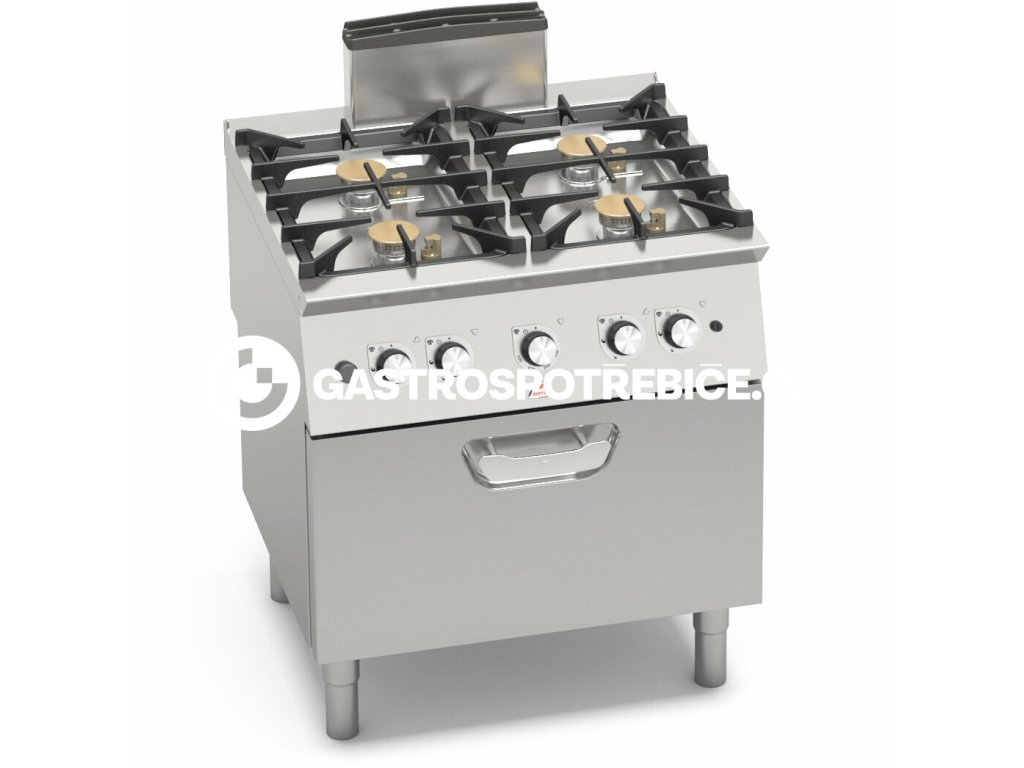 Nové výkonné sporáky linie HIGH POWER vyrobeny z odolné nerez oceli AISI 304. Profesionální poniklované litinové hořáky s vnitřním a vnějším hořením, snadno demontovatelné umístěny v prolisované nerezové vaně vybavené výpustí. Možnost napuštění vody kolem hořáků (snadné a rychlé čištění vypuštěním znečištěné vody). Hořáky s bezpečnostním termočlánkem, zapalovány věčným plamínkem. Kompaktní provedení s výkonnou plynovou troubou GN2/1. Pracovní plocha z nerez oceli AISI 304 tloušťka 2 mm (20/10), přední a boční panely z kvalitní nerezové oceli AISI 304. Litinové hořáky s mosazným víčkem, vybaveny pojistným termoventilem a ochranou pilotního hořáku. Úsporné, ale výkonné hořáky 5 kW jsou umístěny v prolisované hluboké vaně z nerezové oceli AISI 304. Příkon: 4 x 5 + 7,8 kW Počet hořáků: 4 Hmotnost: 110 kgDoplňkové parametry