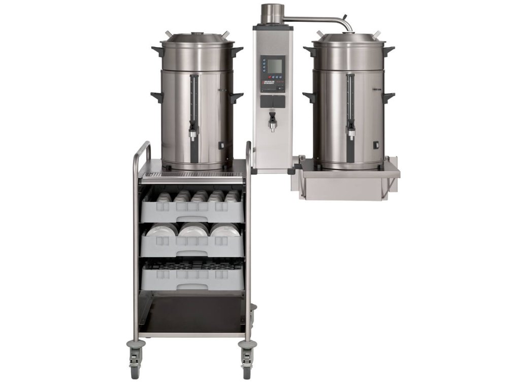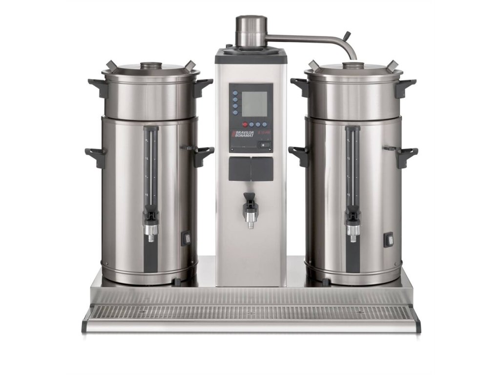 Nástěnné překapávací zařízení na kávu a čaj B10 HW W s pevným připojením vody od holandského výrobce BRAVILOR BONAMAT. nástěnné překapávací zařízení na kávu a čaj s pevným připojením vody k použití ve spojení se servírovacím vozíkem s pevným připojením vody nápoj je překapáván do odnímatelných nádob se skleněným vodoznakem včetně kohoutu na horkou vodu ploché filtry zásobník je umístěn vlevo i vpravo překapávač je standardně uzpůsoben pro výrobu kávy, pro výrobu čaje je nutno dokoupit nástavec pro čajový filtr + čajový filtr dle velikosti nádoby Zařízení je vybaveno: indikátorem zavápnění celkovým a denním počítadlem vydaného množství digitálním ovládáním akustickým signálem dokončení překapávání spínacími hodinami Sestava se skládá z: průtokové jednotky s otočným ramenem a integrovaným kohoutem na horkou vodu 2 zásobníků typu VHG o objemu 10 l filtrační jednotky nástěnné konzole pro průtokovou jednotku Volitelné příslušenství: ploché filtry microfiltr (celonerezový, pro pernamentní použití namísto papírových filtrů) nádoba filtrační nástavec pro filtr čajový filtr čajový výpustný nástavec otočný prodloužený výdejní kohout mixer pro nádobu víka zavírací zásobníky držák nástěnný vozíkDoplňkové parametry