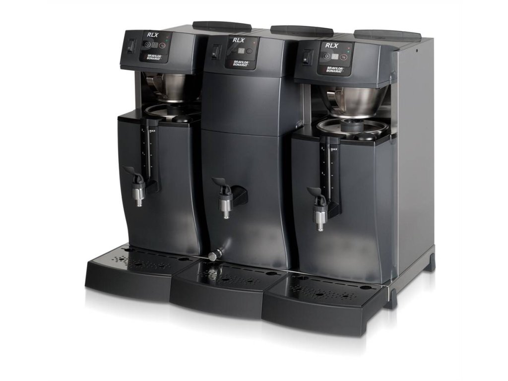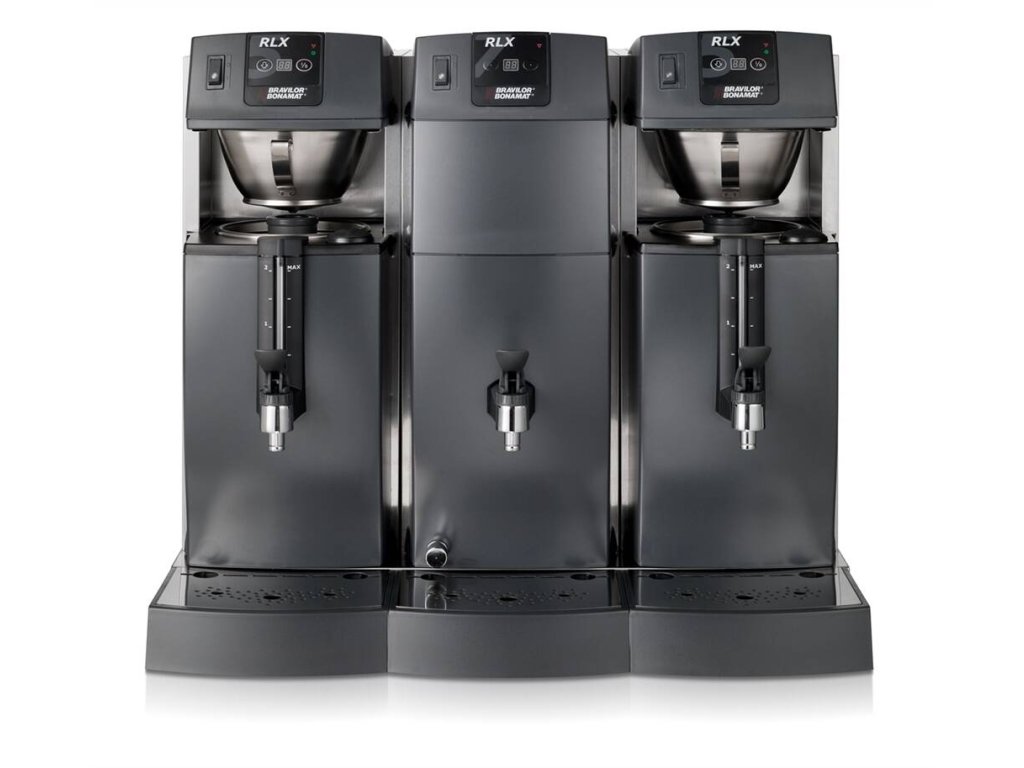 Překapávač kávy RLX 575 od holandského výrobce BRAVILOR BONAMAT. stolní překapávací zařízení na kávu a čaj s pevným připojením vody 3/4" káva je překapávána do zabudovaných zásobníků s průhledným vodoznakem robustní vzhled 2 filtrační jednotky 2 zásobníky s průhledným vodoznakem o objemu 2 litry 1 samostatný kohout pro výdej horké vody 2 nerezové násypníky signalizace zavápnění akustický signál po dokončení překapávání odkapávací miska Volitelné příslušenství: filtrační papíry násypník filtrační nerez násypník na čaj nerez odměrka na kávu výpustný nástavec otočný prodloužený výdejní kohout modul na horkou vodu a páruDoplňkové parametry