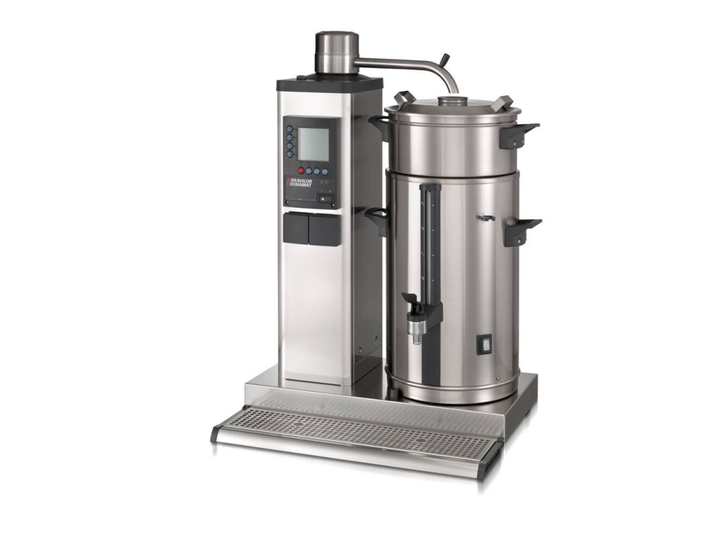 Stolní překapávací zařízení na kávu a čaj B40 R s pevným připojením vody od holandského výrobce BRAVILOR BONAMAT. stolní velkokapacitní překapávací zařízení na kávu a čaj s pevným připojením vody nápoj je překapáván do odnímatelných nádob se skleněným vodoznakem bez kohoutu na horkou vodu ploché filtry umístění zásobníku vpravo překapávač je standardně uzpůsoben pro výrobu kávy, pro výrobu čaje je nutno dokoupit nástavec pro čajový filtr + čajový filtr dle velikosti nádoby Zařízení je vybaveno: indikátorem zavápnění celkovým a denním počítadlem vydaného množství digitálním ovládáním akustickým signálem dokončení překapávání spínacími hodinami Sestava se skládá z: průtokové jednotky s otočným ramenem 1× zásobníku typu VHG o objemu 40 l filtrační jednotky základny odkapávací desky Volitelné příslušenství: ploché filtry microfiltr (celonerezový, pro pernamentní použití namísto papírových filtrů) nádoba filtrační nástavec pro filtr čajový filtr čajový výpustný nástavec otočný prodloužený výdejní kohout miska odkapní mixer pro nádobu víka zavírací zásobníkyDoplňkové parametry