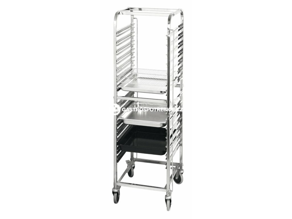Robustní regálový vozík (jeklový) v celonerezovém provedení s odolnými otočnými kolečky (2x bržděnými). Model je v provedení 14x zásuvy pro GN 2/1 (popř.GN1/1) a roztečí 80mm, zámkem zabraňujícím samovolnému uvolnění nádob ze vsunů. Vozíky jsou dodávány v rozebraném stavu, balené v kartonu včetně montážního materiálu (jednoduchá montáž + snížení přepravních nákladů). rozměry (šxdxv) .......... 670x590x1740 mm počet párů zásuvů ....... 14 Rozměr polic: GN 2/1 (popř. GN 1/1) Počet zásuvů: 14 Rozteč zásuvů: 80 mmDoplňkové parametry