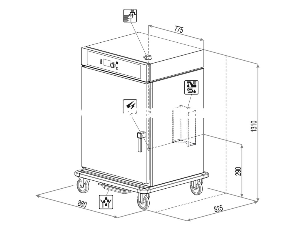 FUNKČNÍ VLASTNOSTI Kontrolní panel teploty, času a vlhkosti. Elektromechanický (C), elektronický s digitálním displejem (D) nebo elektronický s dotykovým LCD displejem (E). Zjednodušené, uživatelsky přívětivé ovládání Provozní teplota 30 °C ÷ 160 °C Inteligentní snížení teploty v dutině na konci regeneračního cyklu umožňuje dokonalé udržení tepla (pouze u verzí D a E). Ruční odvzdušnění vlhkosti Periodická změna směru otáčení ventilátorů pro lepší distribuci vzduchu Skrytý zásobník vody Zvukový signál na konci cyklu Komora s bezpečnostním termostatem Časovač s odloženým startem (pouze u verzí D a E) KONSTRUKČNÍ VLASTNOSTI Těsnicí komora se zaoblenými rohy Pryžové nárazníky po celém obvodu Celková tepelná izolace kamennou nebo skelnou vatou Dlouhodobé přední těsnění z potravinářského silikonu odolného vůči vysokým teplotám. Vyjímatelné boční stojany usnadňující čištění Vnitřní odtok pro snadné čištění Odvětrávaný ohřev zajišťovaný vysoce účinnými chráněnými topnými tělesy Zaklapávací dvířka Upevněno na čtyřech kolečkách o průměru 125 mm, z toho dvě s brzdou Ergonomické rukojeti pro tlačení a vedení Snadný přístup pro usnadnění údržby a oprav MOŽNOSTI A PŘÍSLUŠENSTVÍFUNKČNÍ VLASTNOSTI Jednobodová jádrová sonda (pouze pro verze D a E) Automatický odvzdušňovač vlhkosti (Climachef - pouze pro verze D a E) Vícebodová jádrová sonda (pouze pro verze D a E) Systém redukce otáček ventilátoru Speedgrade (pouze pro verze D a E) USB port pro ukládání zařízení HACCP (pouze pro verze D a E) Zásobníky Mřížky Boční regály 600x400 Jehlová jádrová sonda (pouze pro verze D a E) Software One Touch Opačný boční otvor Skleněná dvířka a osvětleníDoplňkové parametry