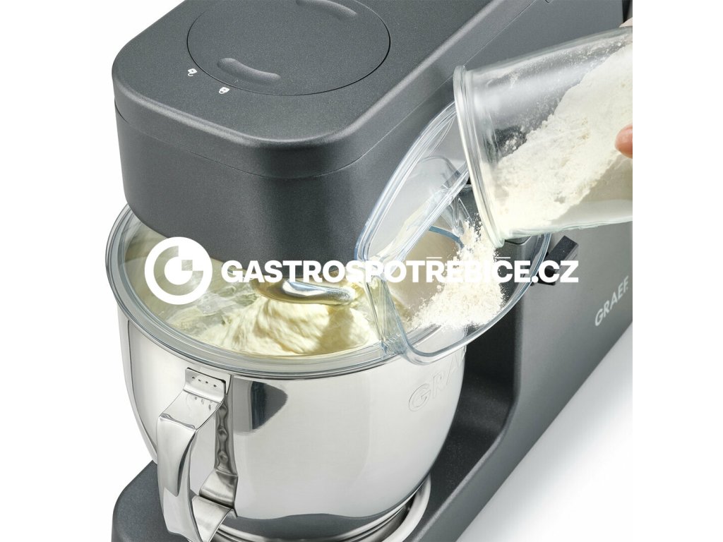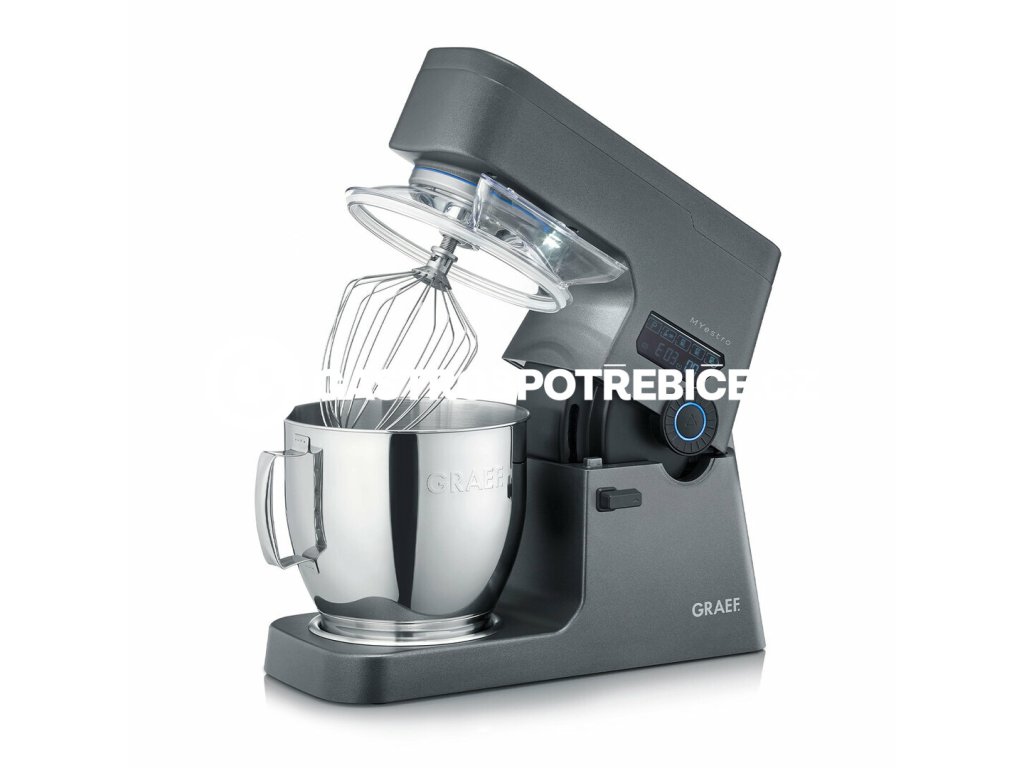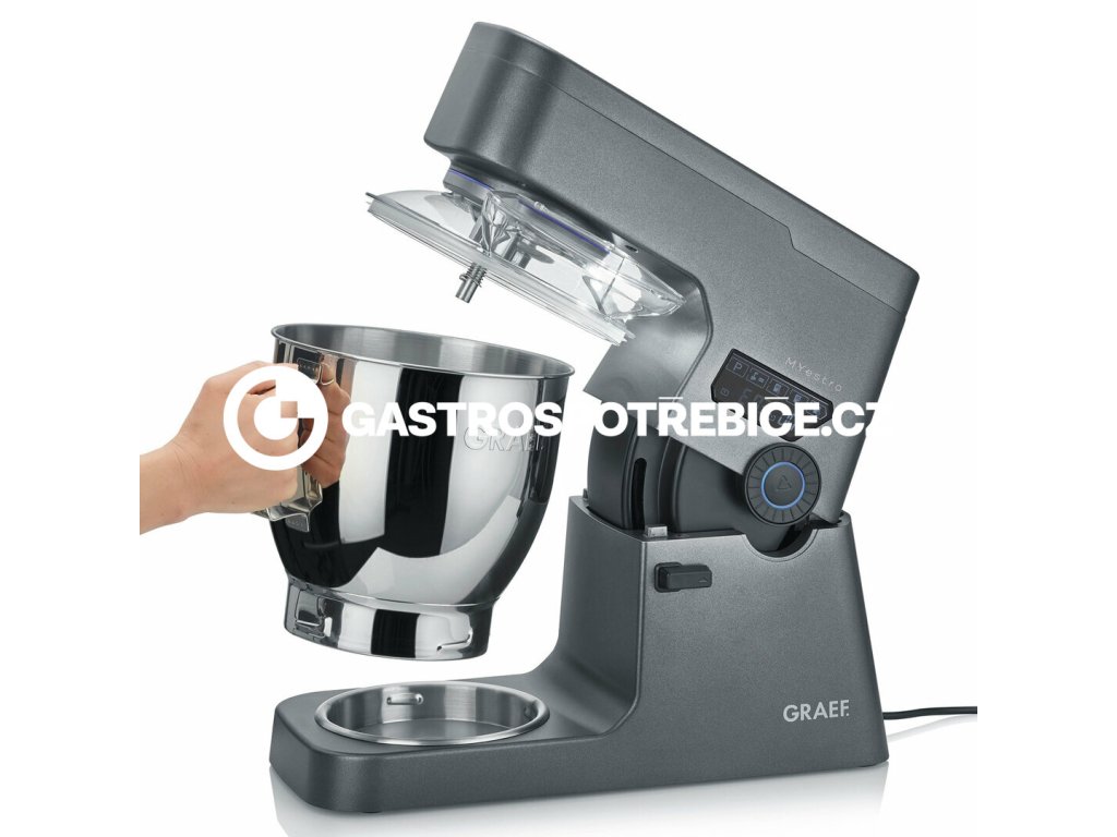 Nepostradatelní pomocníci do ambiciózní kuchyně - S těmito spotřebiči se každý může vydat na lov vůní a objevit překvapivé chutě. Profesionální motor DC motor MYestro o výkonu 800 W zvládne i skutečné profesionální úkoly a nabízí optimální poměr spotřeby energie a výkonu. Oproti jiným motorům s vyšším výkonem má tento motor výrazně vyšší účinnost a tím i lepší energetickou účinnost. Hladký chod díky řemenovému pohonu Robot je poháněn motorem přes odolný řemen. Tento řemenový pohon zajišťuje optimální přenos síly a zaručuje tichý chod s maximální plynulostí chodu bez překlápění nebo viklání. Hladina hluku: ≤ 60 dB (vzdálenost měření: 1 m) Jednoduchá obsluha Hnětení, míchání, šlehání – pokud spěcháte, jednoduše si na intuitivním dotykovém displeji zvolíte jeden ze tří plně automatických programů. MYestro má také praktickou pulzní funkci pro krátké, individuální mixování stisknutím tlačítka a funkci vybavení pro připojení dalšího příslušenství. Rychlosti hnětení (stupně 1 - 10) a časy (0 - 30 min.) lze zvolit také ručně dotykem prstu a lze je snadno nastavit díky inovativnímu otočnému voliči pod dotykovým displejem. Inovativní osvětlení Jasná LED dioda zajišťuje optimální osvětlení mísy, takže při přípravě těsta máte vždy vše pod kontrolou. Kromě osvětlení mísy je MYestro vybaveno také osvětlením Blue Ambience, které stylově podtrhuje moderní design stroje. Celokovové pouzdro Díky vyváženému celokovovému krytu dosahuje stojanový mixér GRAEF MYestro také jedinečné stability, díky solidní hmotnosti produktu 18 kg i při zpracování těžkých těst. Uvolnění jednou rukou Uvolňovací páku lze ovládat jednou rukou, takže motorová hlava stojanového mixéru se díky pružinovému mechanismu snadno vyklopí nahoru a lze ji zapojit pro plnění surovin nebo výměnu mixovacích prvků. Po otevření má MYestro výšku 59 cm. Spirálové míchadlo Robustní spirálový systém míchání MYestro zajišťuje velmi důležité rovnoměrné výsledky i u chlebového těsta. Všechny ingredience od okraje ke dnu mísy jsou přenášeny a smíchány beze zbytku. V závislosti na variantě těsta se příslušný míchací nebo hnětací prvek po naklonění hlavy motoru jednoduše vloží do odpovídajícího zařízení a krátkým otočením se zapojí. Odnímatelná ochrana proti stříkající vodě Ochranu proti stříkající vodě pro mixovací nádobu lze zaseknout ve třech různých polohách na hlavě motoru, v závislosti na požadovaném směru otevírání plnicího otvoru. Zajistí, aby suroviny při přípravě těsta skutečně zůstaly v míse a neskončily na podlaze v kuchyni. Extra velký plnicí otvor Zákryt je vybaven extra velkým plnicím otvorem včetně víka. Prostřednictvím tohoto otvoru lze pohodlně a čistě přidávat další přísady i během přípravy těsta. Obsah balení Přiložená 7litrová mixovací nádoba z nerezové oceli s označením množství náplně nabízí dostatečnou kapacitu pro velké množství lahodného těsta. Například lze zpracovat až 3 kg tuhého kynutého těsta, 20 bílků nebo 1,2 kg smetany. Součástí dodávky stojanového mixéru MYestro od GRAEF jsou kromě ochrany proti stříkající vodě také balónová metla, hnětací hák a plochý šlehač. Tři nerezové mixovací prvky lze mýt v myčce.Doplňkové parametry
