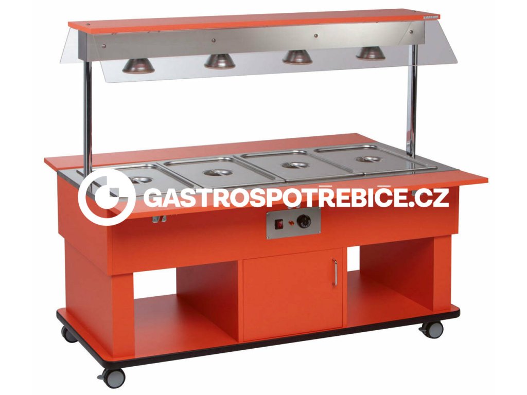 Vyhřívaný salátový bar HAPPY BM / INFRA se strukturou vrstveného dřeva. Horní rampa je vybavena infra osvětlením a pevným hygienickým zákrytem. Model je v pojízdném provedení (2 kola s brzdou). Nerezová nedělená vana BM (vodní lázeň, hloubka 180 mm) s vypouštěcím kohoutem a vybavena dvěma čelními sklopnými policemi. Snadné elektromechanické ovládání (termostat) pro nastavení teploty vany (+30°/+90 °C), horní rampa je doplněna o infračervené zářivky s nízkým příkonem (120 W) s nezávislým vypínačem a kontrolkou chodu. Zařízení v základu dodáváno bez výbavy GN (na vyžádání) a dalšího volitelného příslušenství.Doplňkové parametry