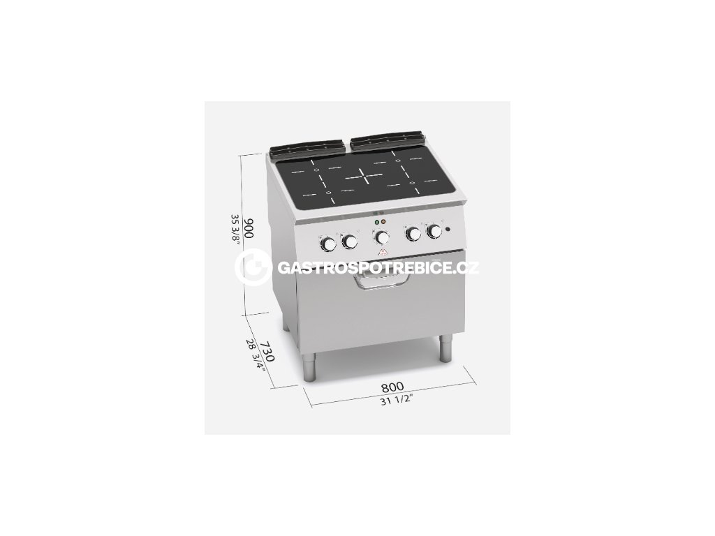 Keramická varná deska tloušťka 6 mm. Vyzařující topné prvky, schopny dosahovat vysokých teplot (do 500°C). Hranaté varné zóny 230x230 mm (barevně vyznačeny na varné desce pro správné umístění nádobí) s výkonem 2,5 kW. Světelná signalizace zbytkového tepla do 60°C při vypnutí každé zóny pro využití zbytkové energie a ochranu uživatele. Elektrická ventilovaná trouba (400V/6 kW, dva výkonné ventilátory), komora trouby z nerez oceli AISI 430, vybavena 4 zásuvy (1x rošt GN2/1 ve standardu), zesílené prolisované nerezové dveře doléhají na speciální obzvláště odolné těsnění s dlouhou životností. Pracovní deska z kvalitní nerez oceli AISI 304 tloušťka 2 mm (20/1), přední a boční opláštění z nerezové oceli AISI 304. Termostatický ventil 30 až 300°C pro přesnou a bezpečnou regulaci. Termočlánek a chráněný zápalný plamínek. Dvojvrstvá grilovací plotna (umístěná v prolisované zesílené pracovní desce, tloušťka 2 mm, vybavena odtokovým otvorem) složená z ocelového plátu a horní vrstvy z nerez oceli AISI 316 s leštěným povrchem, který umožňuje snadné čištění. Nízká úroveň odlesku zvyšuje komfort při práci. Příkon: 4 x 2,5 + 6 kW Počet zón: 4 Hmotnost: 90 kgDoplňkové parametry