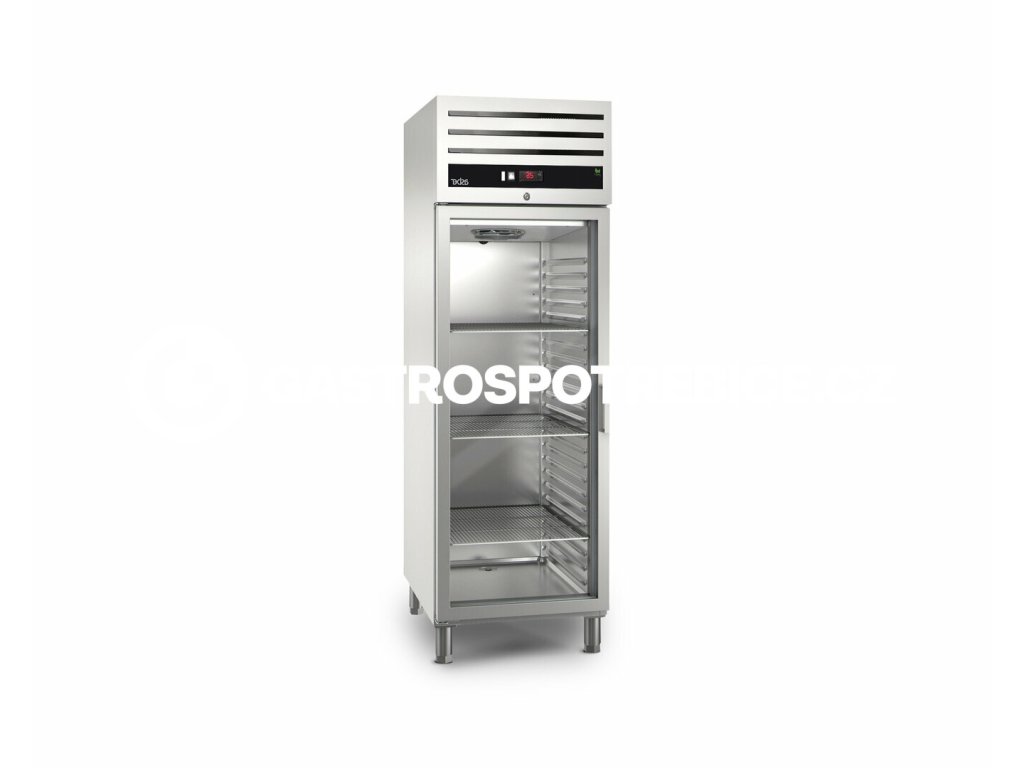 Speciálně vyrobené z vysoce kvalitní nerezové oceli pro intenzivní profesionální aplikace, vyznačující se velmi robustním designem a perfektní dokončovací práce. 60 mm tloušťka, bez freonů, vysokohustotní (40 kg/m³) polyuretan izolace, vstřikovaná pod vysokým tlakem. Dveře s dvojitým zasklením izolované plynem s nízkou tepelnou emisivitou snížit přenos tepla. Ergonomická klika dveří zamak potažená niklem. Pantové dveře s automatickým návratem pro dokonalé zavírání a minimalizovat nárůst teploty. Dveře mají klidovou polohu 120° a se automaticky zavřou pod úhlem méně než 90°. Vybaveno zámkem dveří. Intuitivní digitální ovládání umožňuje nastavení teplotních parametrů nastavit snadno a rychle. Světelné tlačítko start-stop světla. „Ventilace Gill“ na předním panelu udržuje systém chladicí jednotky větrané a běží efektivněji. Kompaktní monoblokový chladicí systém namontovaný v horní části stroje umožňuje snadný přístup pro údržbu a optimalizaci skladovací kapacita chladničky. Inteligentní systém nuceného tahu zajišťuje homogenitu teplota v chlazeném prostoru. Dveřní spínač zastaví ventilátor při otevření dveří, aby se zabránilo studenému vzduchu opuštění interiéru a tím úsporu energie. Automatické odpařování rozmrazené vody. Horký plyn vychází z kompresor se používá k automatickému odpařování rozmrazené vody, místo pomocí topných těles, čímž se dosáhne ještě méně energie spotřeba. Vnitřní LED osvětlení s nízkou spotřebou energie pro zobrazení vnitřek skříně. Tlačítko ON-OFF pro lepší vnitřní viditelnost, když jsou dveře otevřené nebo zavřené. Výškově nastavitelné nohy z nerezové oceli. Výška nohou může být nastavit individuálně (125 mm - 200 mm), aby bylo pohodlné čištění. Nožní pedál a kolečka jsou k dispozici jako volitelná výbava. Lisovaná vodítka se zaoblenými hranami umožňují pohodlnější práci čištění bez jakýchkoli potíží. Umístění a seřízení mřížky jsou také jednodušší než kdy jindy. Poplastované drátěné mřížky umožňují skladování různých typů obalů a mají maximální zatížení nosností až 40 kg. Odnímatelné vytahovací/zasouvací magnetické těsnění dveří pro udržení maximální hygienu a zachování izolačních vlastností. Lisovaný spodní panel s odtokem vody speciálně navržený pro urychlují a usnadňují čištění, což je optimální pro hygienu. Vnitřek se zaoblenými hranami, snadnější čištění potenciální lapače nečistot. 23 poloh mřížky pro zvýšenou nosnost s 55 mm vzdálenost mezi nimi. Vhodné pro nádoby na potraviny GN 2/1 nebo 2 x GN 1/1. Vybaveno 3 mřížkami GN 2/1 na každé plné dveře. Chladicí plyn: R600a uhlovodík (HC). Pracovní teplota 0 ºC až +8 ºC v podmínkách klimatické třídy IV. Napájecí napětí: 230 V 1+N – 50 Hz. L - levé otevírání dveříDoplňkové parametry