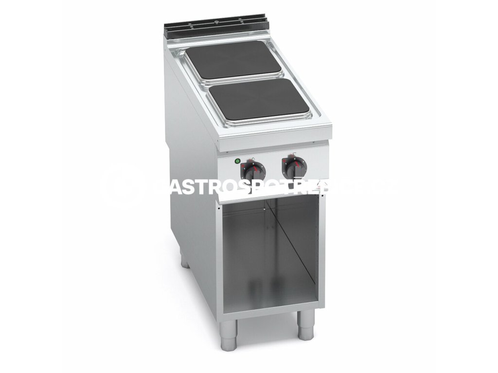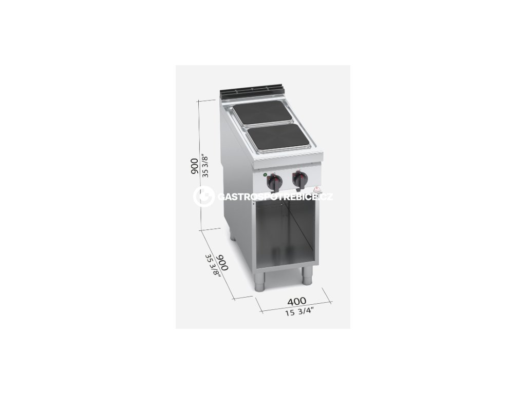 Pracovní plocha a opláštění z nerez oceli AISI 304. Litinová varné plotýnky s bezpečnostním termostatem a regulací výkonu. Kompaktní provedení s otevřeným podstavcem. Sporák je vybaven dvěmi varnými plotýnkami z litiny s plochou 300x300 mm. Každá plotýnka má výkon 3,5 kW a dosáhne teploty 400 °C. Pracovní plochu lze doplnit o ocelovou výplň prostoru mezi plotnami, čímž se dosáhne celistvé pracovní plochy.Teplota je regulována nezávisle nastavitelnými spínači. Přímá kontrola teploty umožňuje významně uspořit energie. Topná tělesa jsou hermeticky uzavřena v jednom celku, který je lisován v rovině do varné desky. Provedení: elektrika Počet ploten: 2 Celkový příkon: 7 kWDoplňkové parametry