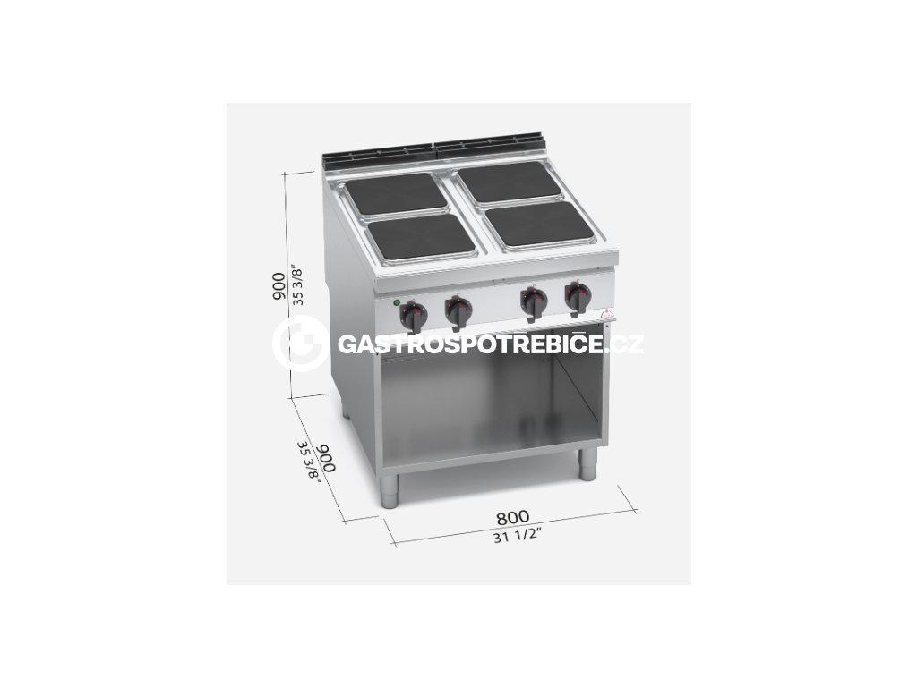 Pracovní plocha a opláštění z nerez oceli AISI 304. Litinové varné plotýnky s bezpečnostním termostatem a regulací výkonu. Kompaktní provedení s otevřeným podstavcem. Sporák je vybaven čtyřmi varnými plotýnkami z litiny s plochou 300x300 mm. Každá plotýnka má výkon 3,5 kW a dosáhne teploty 400 °C. Pracovní plochu lze doplnit o ocelovou výplň prostoru mezi plotnami, čímž se dosáhne celistvé pracovní plochý. Teplota je regulována nezávisle nastavitelnými spínači. Přímá kontrola teploty umožňuje významně uspořit energie. Topná tělesa jsou hermeticky uzavřena v jednom celku, který je lisován v rovině do varné desky. Provedení: elektrika Počet ploten: 4 Celkový příkon: 14 kWDoplňkové parametry