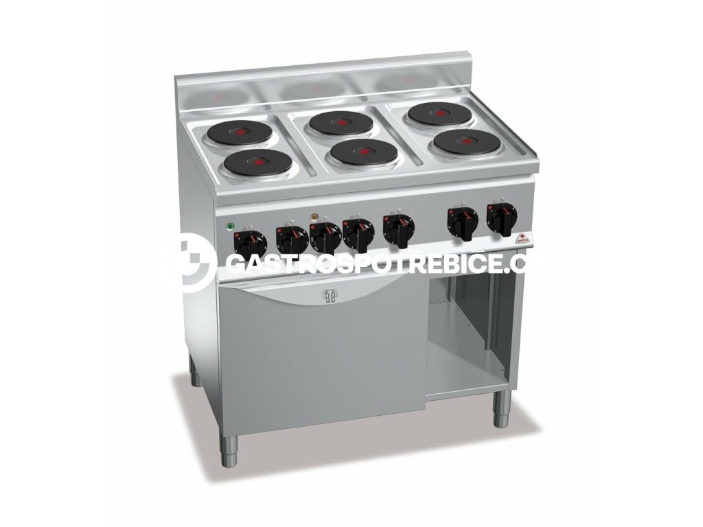 Elektrické sporáky jsou vybaveny kulatými litinovými plotnami Ø 180 mm a výkonem 2 kW. Teplota je regulována nezávisle nastavitelnými spínači. Elektrická konvekční trouba vhodná pro GN 1/1 s kvalitním těsněním dveří. Provedení: elektrika Počet ploten: 6 Trouba: 4x GN1/1 Celkový příkon: 15 kWDoplňkové parametry