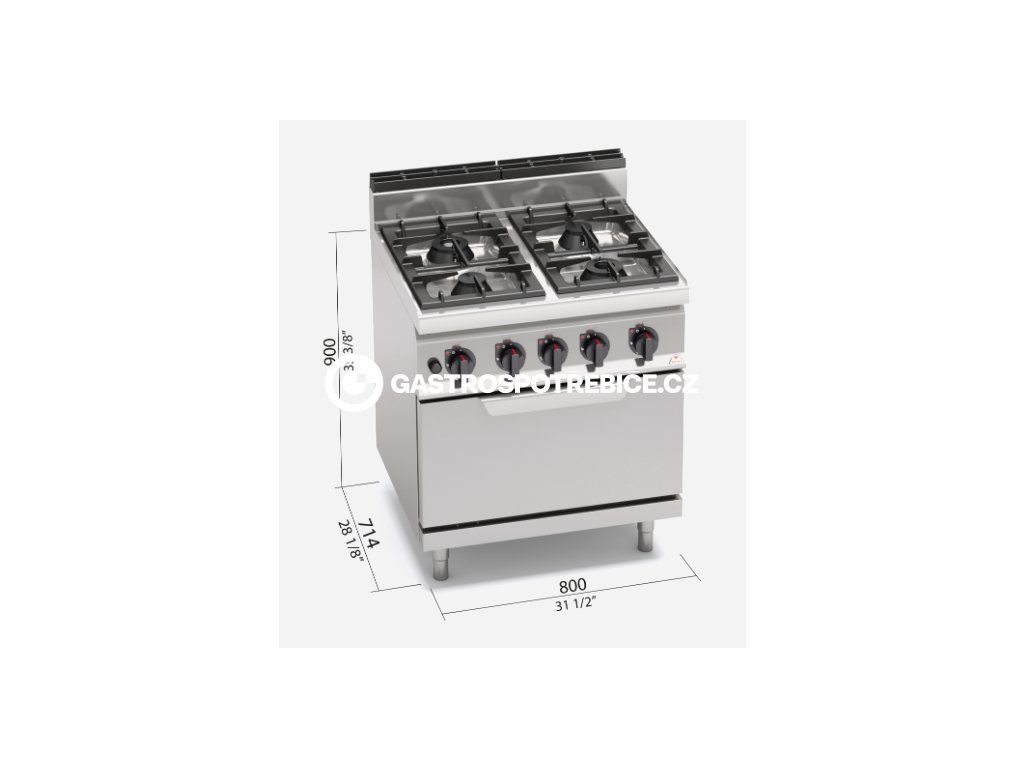 Příprava jídel přímo na plameni je u všech kuchařů nezbytná pro zdůraznění tradičních kulinářských dovedností. Tvar litinových roštů tvoří optimální pracovní plochu pro snadnou manipulaci s nádobím. Silné litinové hořáky 7 kW zaručují nadstandardní výkon a životnost. Vysoká energetická účinnost plynových hořáků umožňuje uspořit nejméně 30% plynu ročně v porovnání s tradičními hořáky. Odkapové vaničky pod hořáky mají zaoblené hrany, jsou kompletně odnímatelné. Vše je navrženo tak, aby byla snadná údržba a čištění. Pracovní plocha a opláštění z nerez oceli AISI 304. Výkonné litinové hořáky HIGH POWER, snadno demontovatelné a umístěné ve vyjímatelných prolisovaných smaltovaných (nerezových) odkapových vanách. Zapalování hořáků věčným plamínkem. Plynové trouby, pro 4x GN2/1, jsou vybaveny piezoelektrickým zapalováním a ovládány inovovanými ovladači s dvojitou konstrukcí prodlužující životnost. Provedení: plyn Počet hořáků: 4 Trouba: 4x GN2/1 Celkový příkon: 35,8 kWDoplňkové parametry